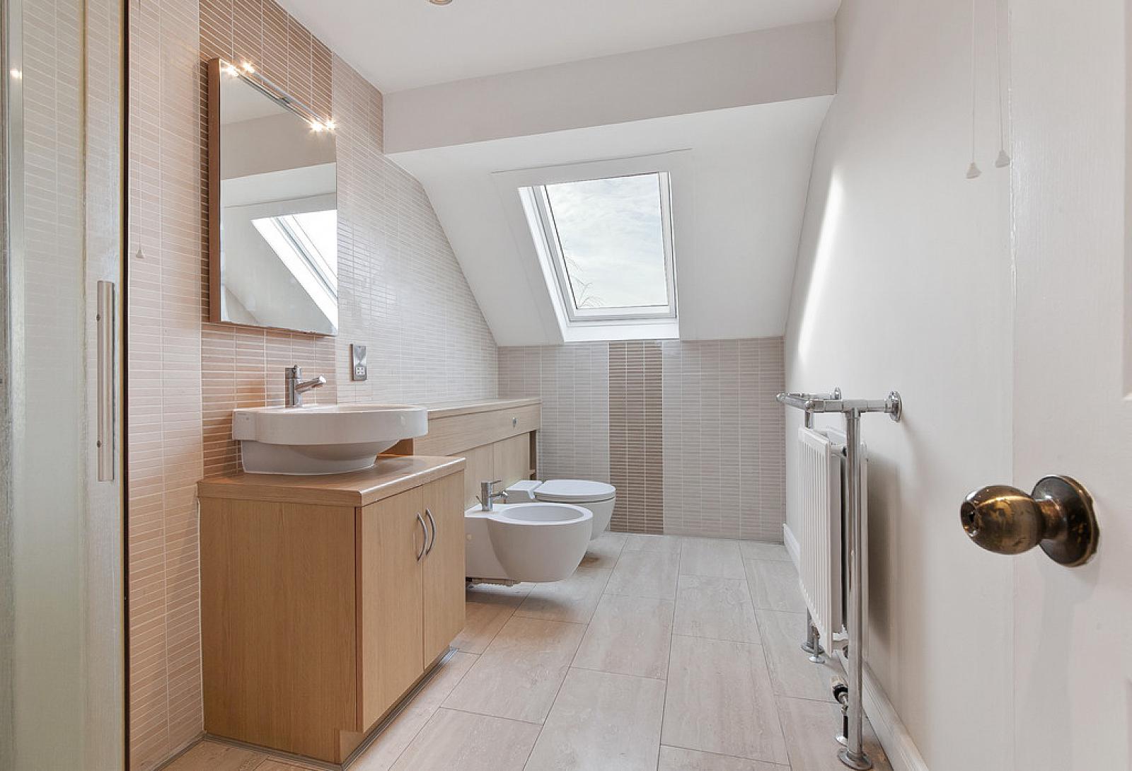 SHOWER ROOM Enclosed shower cubicle, low flush WC with concealed cistern, bidet, vanity wash hand basin, tiled floor, stainless steel towel radiator, extractor fan, recessed low voltage spotlights.