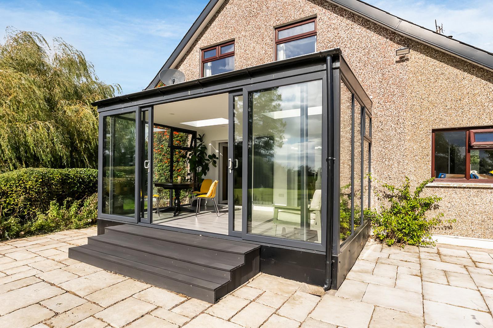 Kitchen with dining area open to bright sunroom overlooking gardens