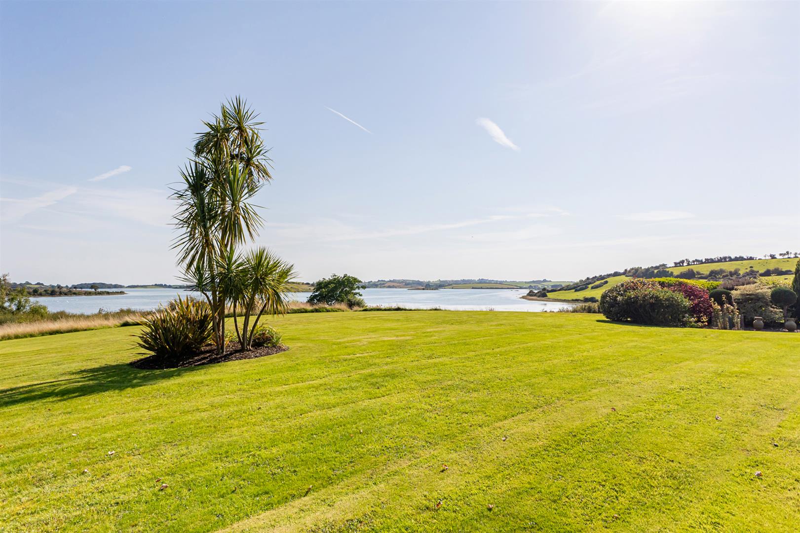 Large bedroom space with recessed spotlighting, contemporary wall mounted radiators, dual aspect with fabulous views across formal lawn to gardens to Lough, Long Island, Wood Island and Reagh Bay, uPVC double glazed French doors to south facing patio maximising on outlook and views, open through square arch to fully fitted walk-in dressing room.