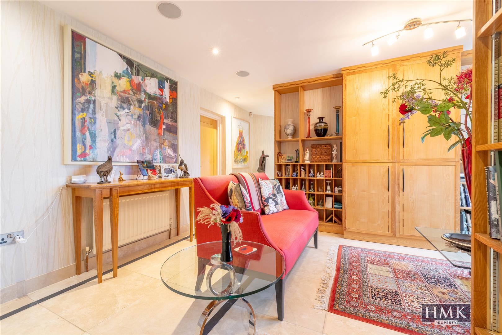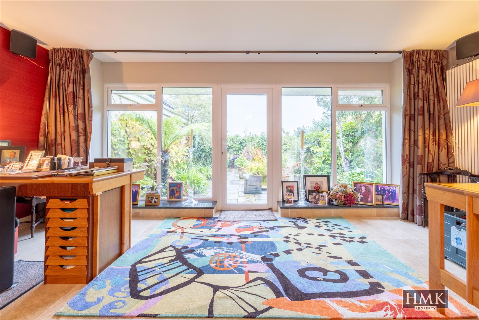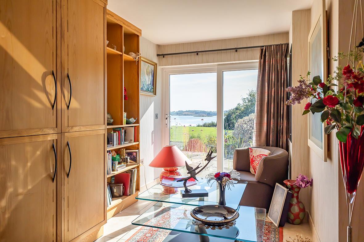 A custom designed fitted library with built-in book display shelving, additional cabinetry for audio, built-in ceiling speakers, recessed spotlighting and uPVC double glazed sliding patio doors to south facing patio, formal gardens and views to Strangford Lough.