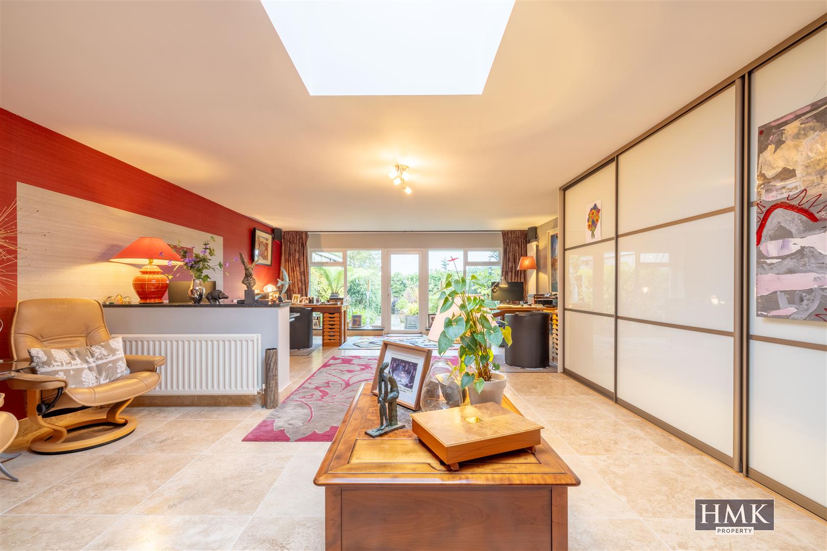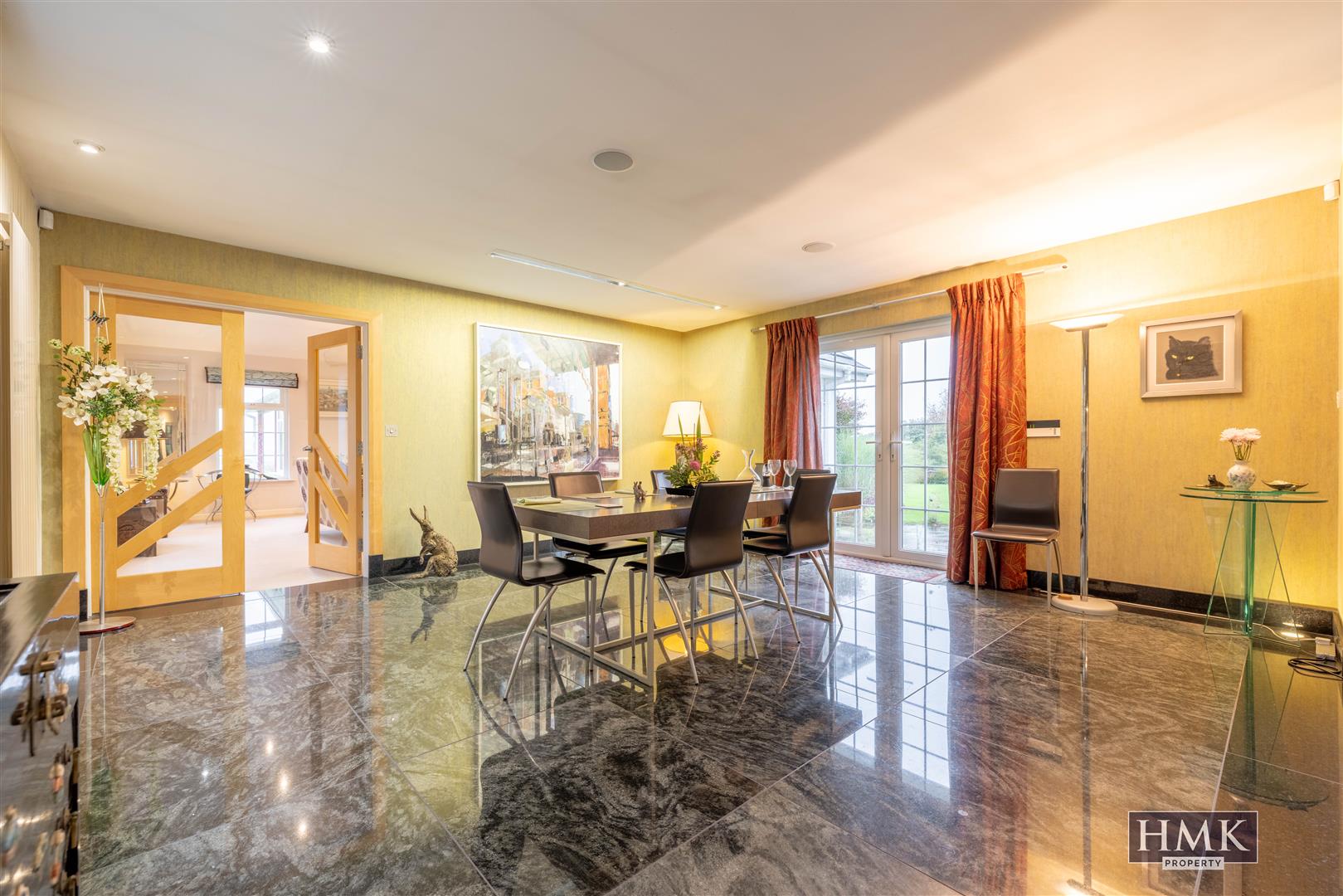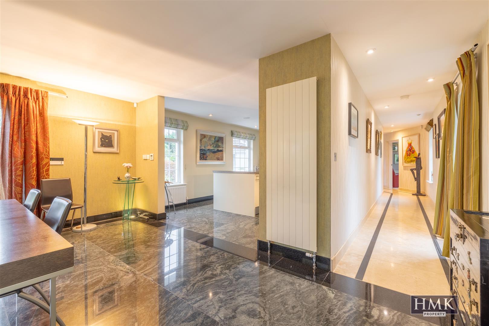 With dual aspect to front and rear gardens, uPVC double glazed French doors to south facing patio and formal gardens, polished granite floor tiling and upstand, recessed spotlighting, built-in speaker system, built-in ceiling speakers, open through square arch to kitchen.