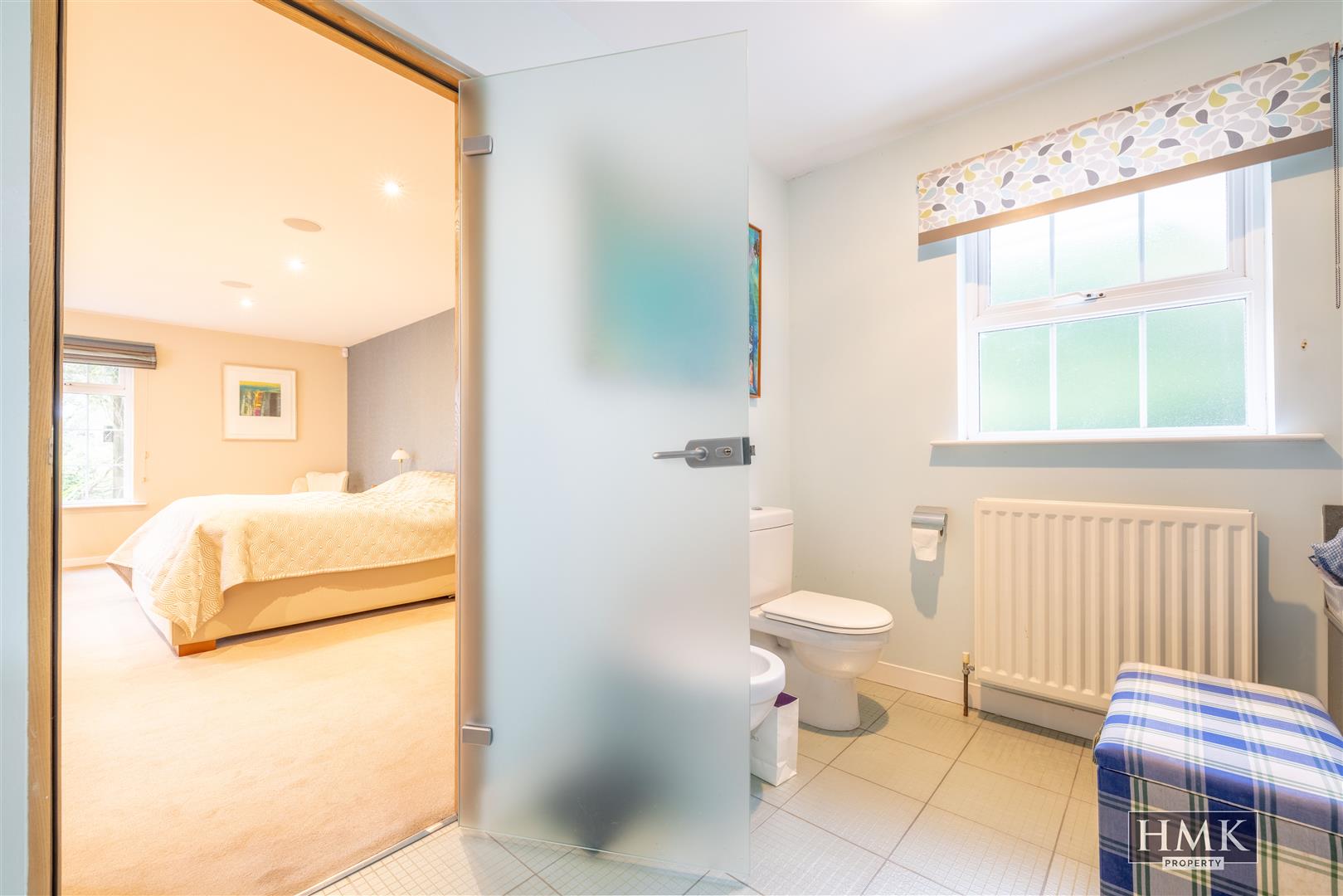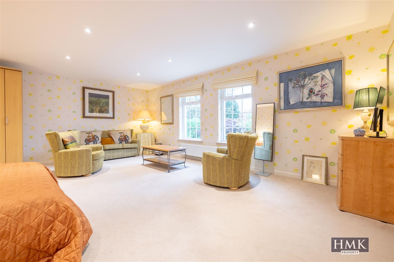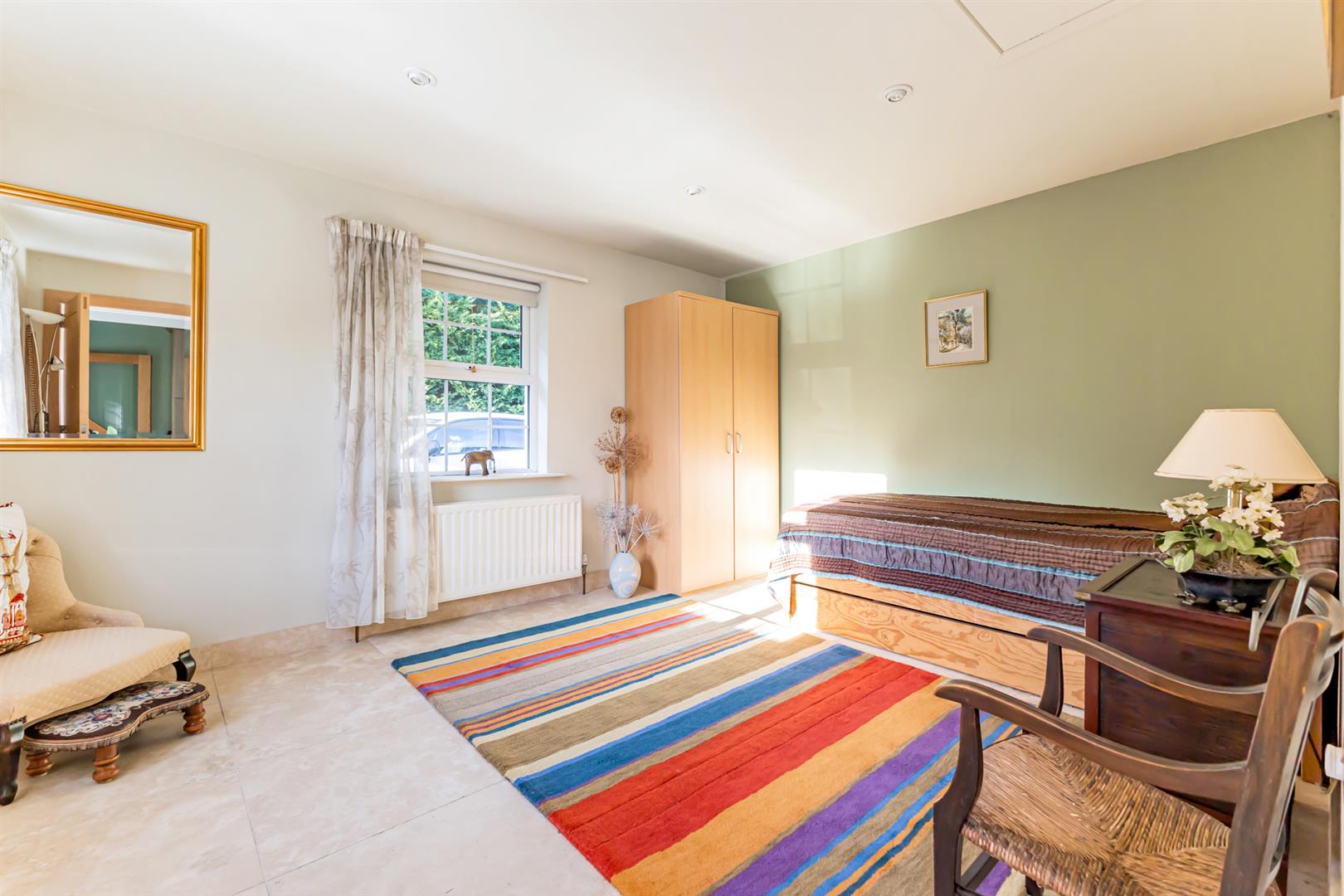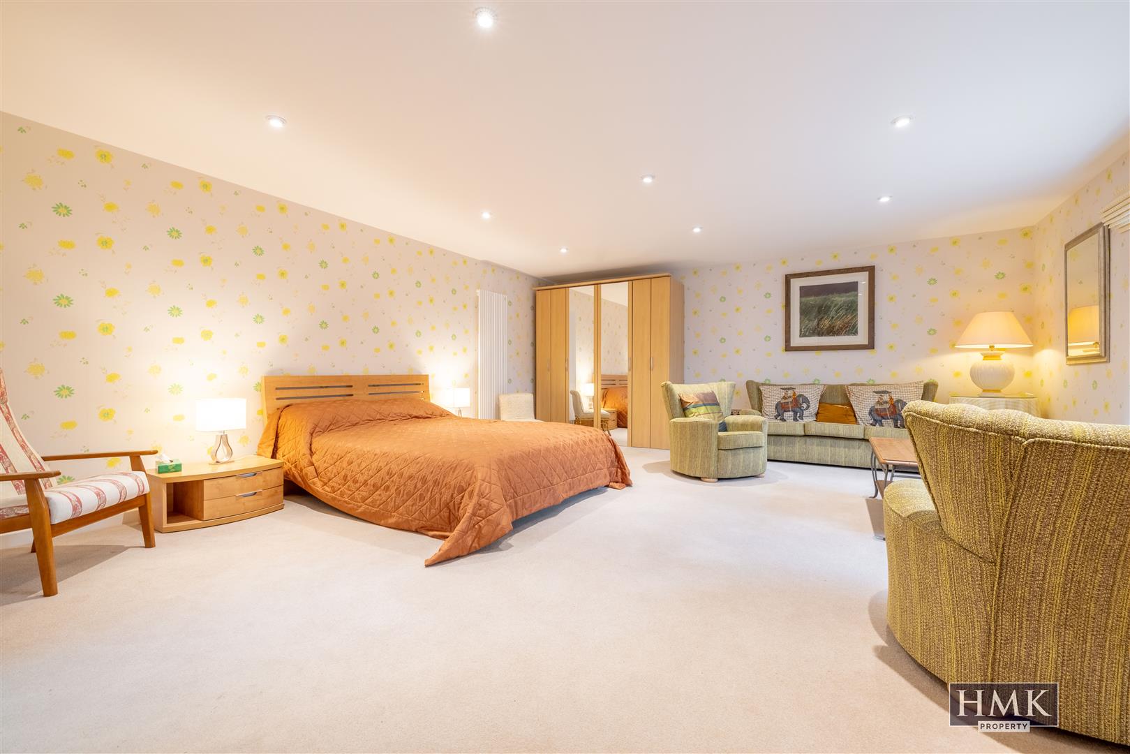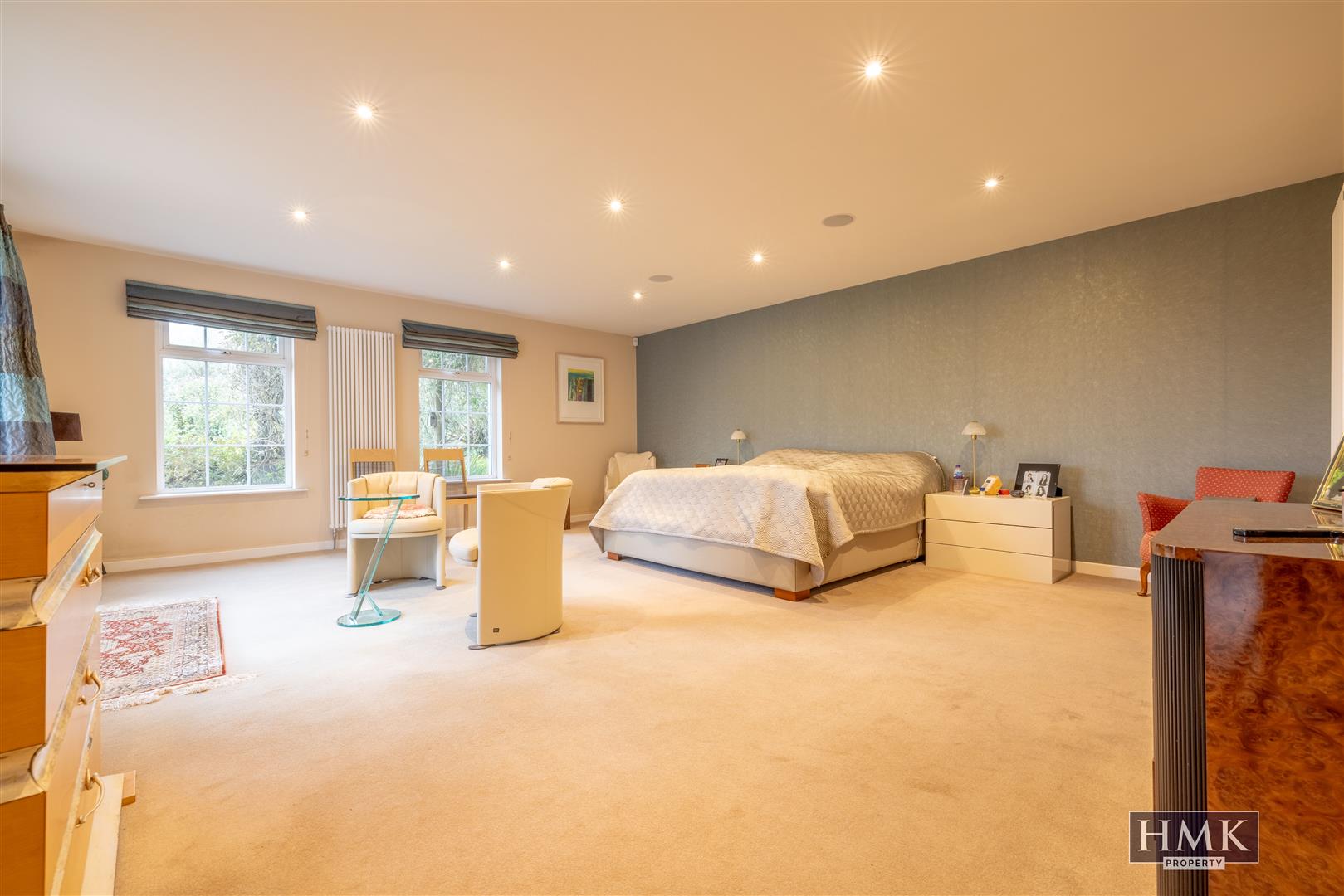 Large bedroom area with recessed spotlighting and wall mounted contemporary radiators, mature outlook to easterly aspect.