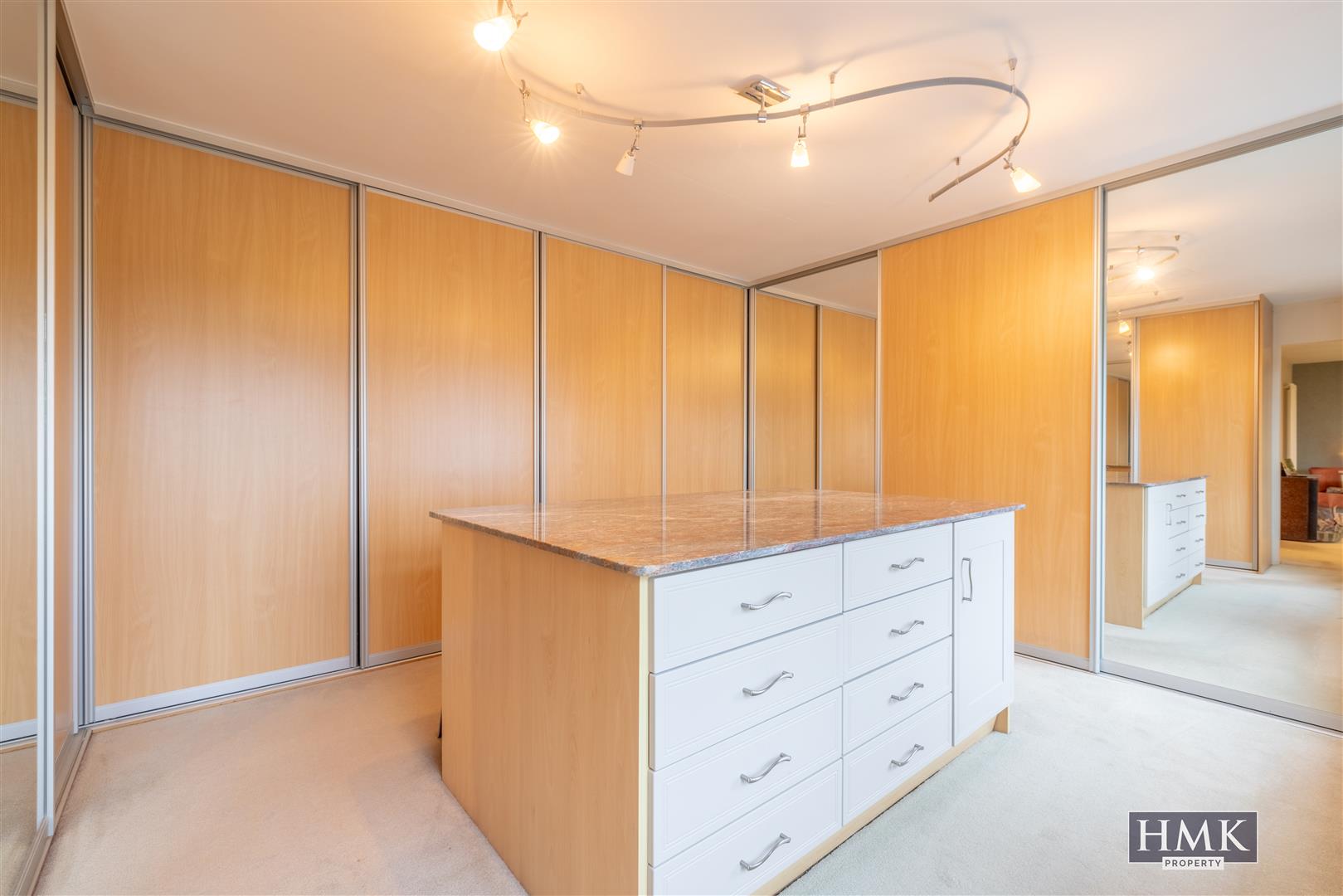With extensive range of built-in robes with sliding fronted doors, dressing table, marble work surface, built-in drawer units, additional cabinetry, views across South facing patio and formal lawns to Strangford Lough and Long Island.