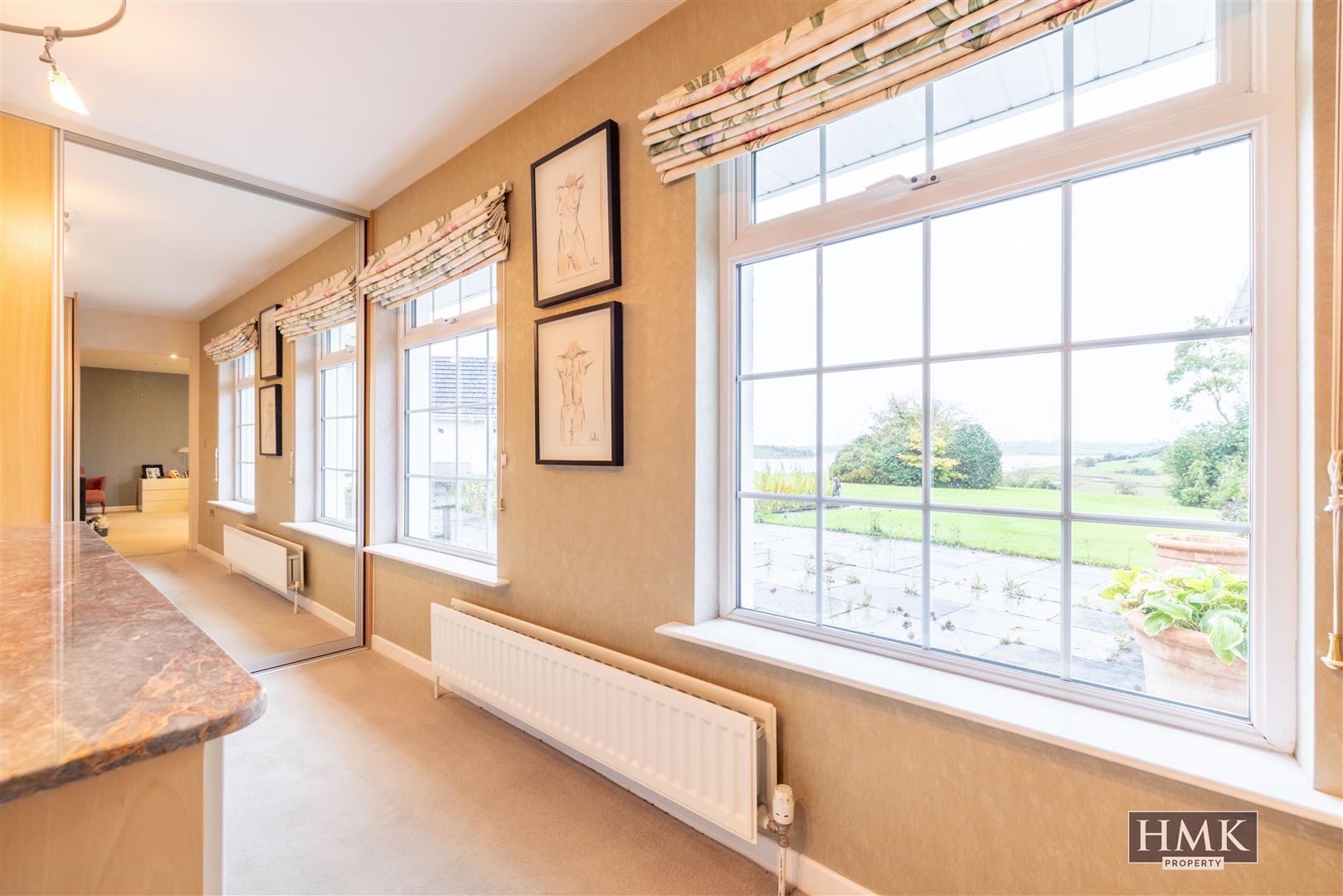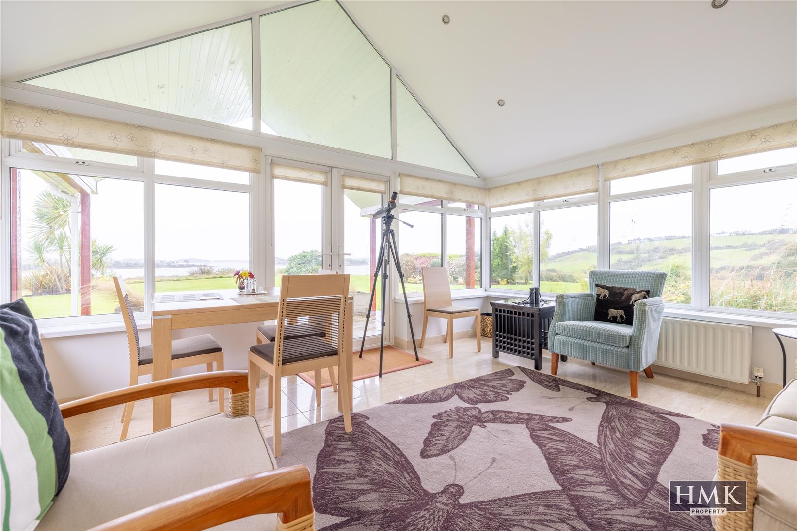 With vaulted ceiling, recessed LED spotlighting, Porcelain tiled floor, fitted blinds with tri-aspect outlook across formal lawns and gardens to Strangford Lough and various islands, uPVC double glazed French doors to covered viewing gallery patio maximising on the outlook to Strangford Lough and the various inlets and islands.