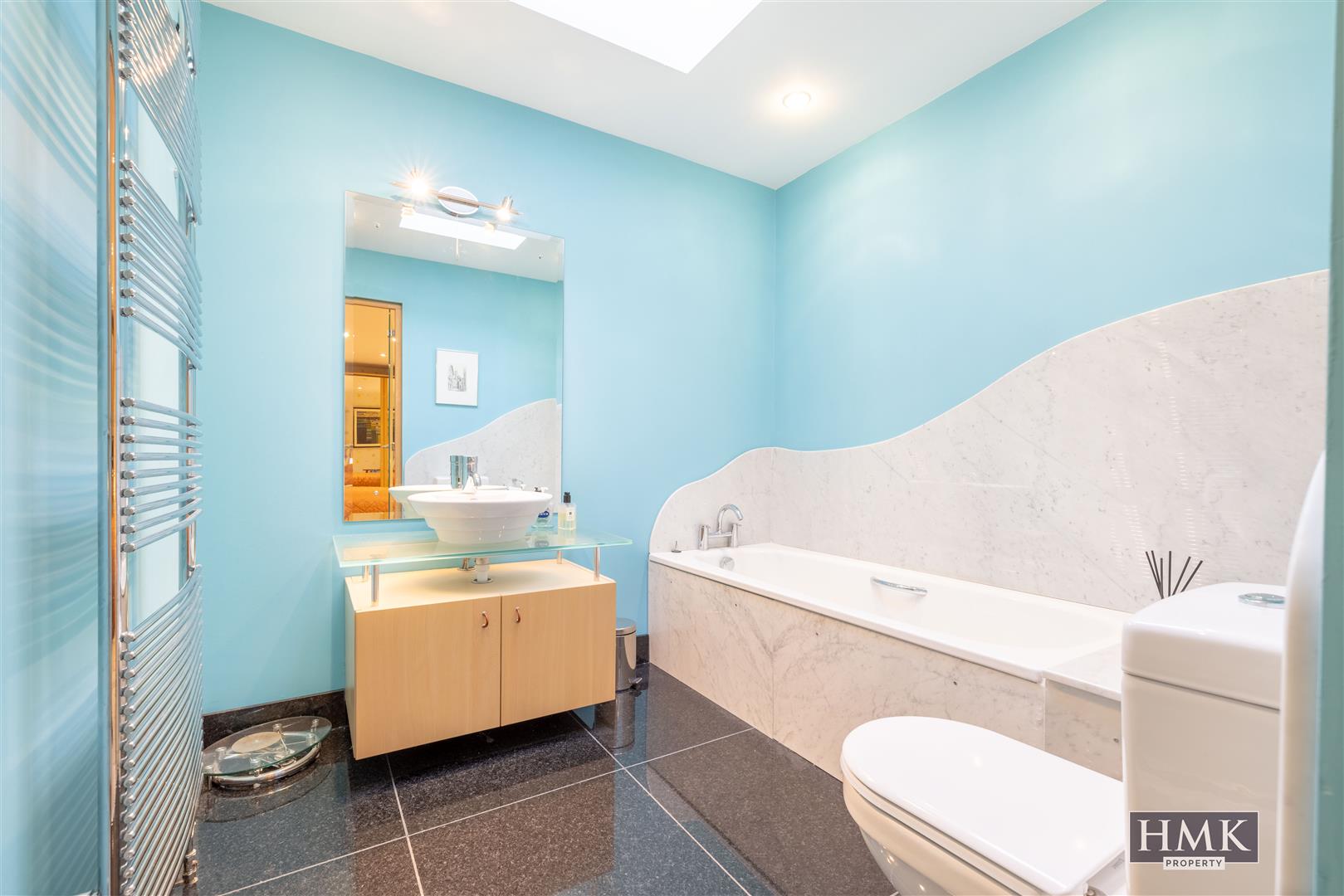 A modern white suite comprising low flush WC, marble panelled deep fill bath with chrome mixer taps, marble splashback, polished granite tile flooring, vanity unit with circular ceramic basin, chrome mixer taps on glass stand, cabinetry below, Velux skylight, chrome heated towel rail and marble panelled shower cubicle with thermostatically controlled shower unit.