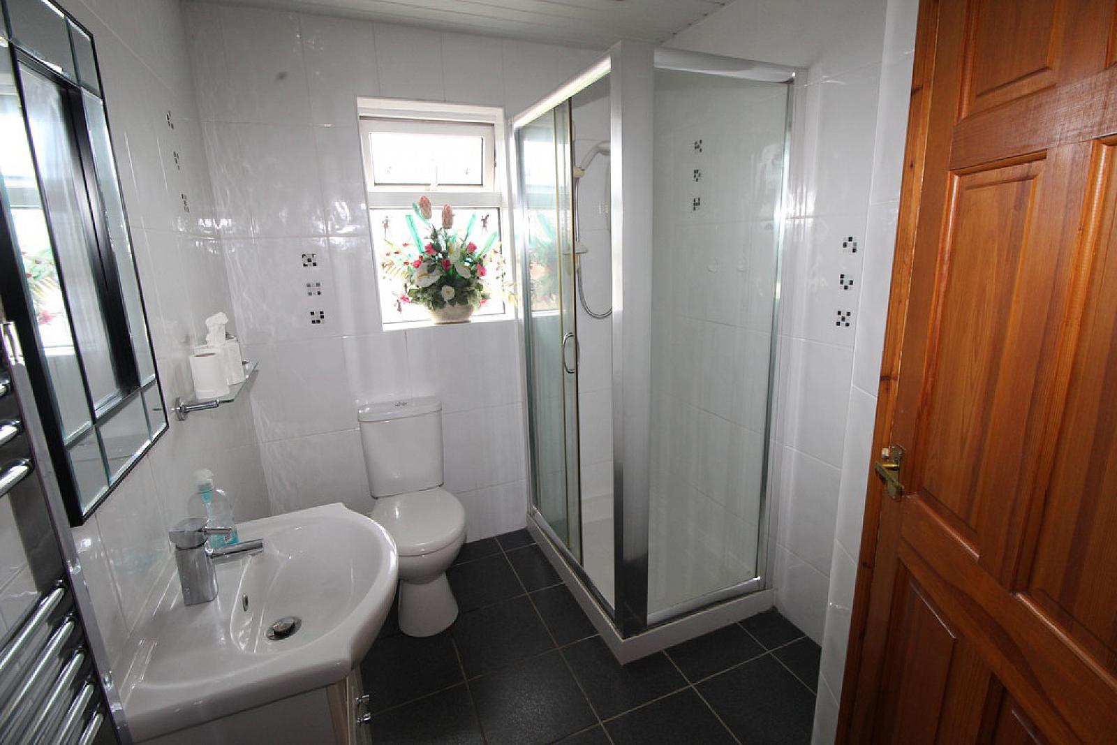 SHOWER ROOM Shower cubicle with sliding screen door. Electric fitted shower. Low flush WC. Vanity unit. Heated towel rail. Downlighters. Fully tiled walls. Ceramic tiled floor. PVC ceiling. Hotpress comprising copper cylinder tank with Willis Type immersion heater.
