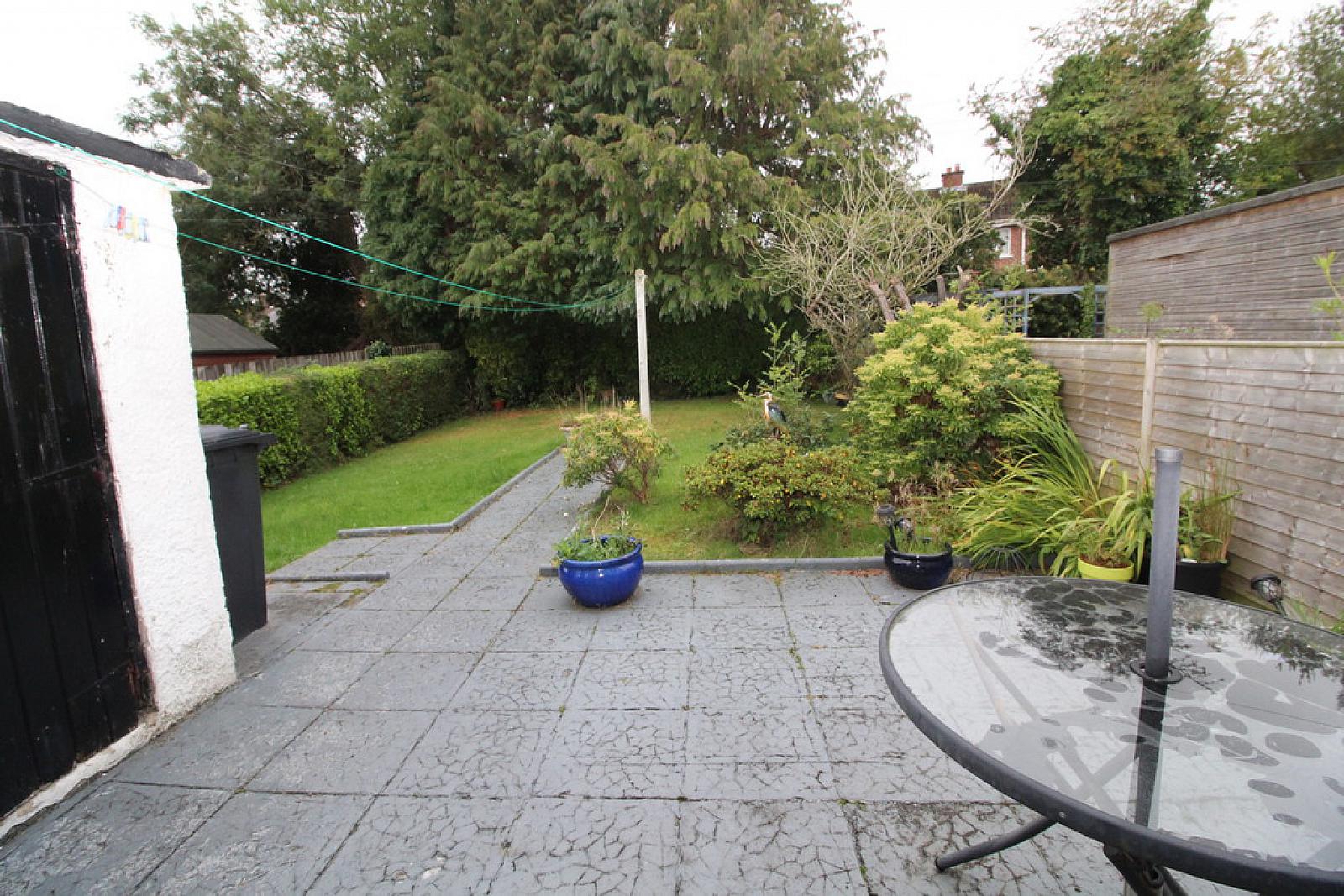 Rear in lawn, paved patio area, outside storage