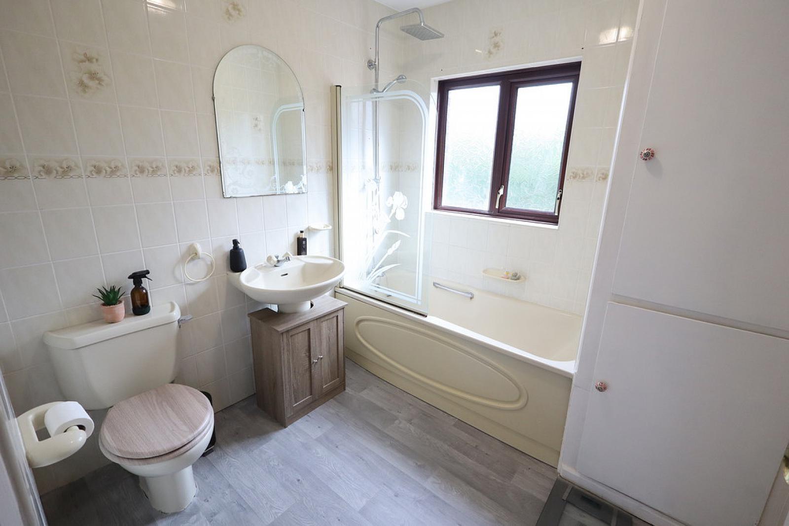 BATHROOM Panelled bath unit, controlled shower with rainwater effect shower head, glazed shower screen, wall tiling, low flush W/C, pedestal wash hand basin, linen cupboard