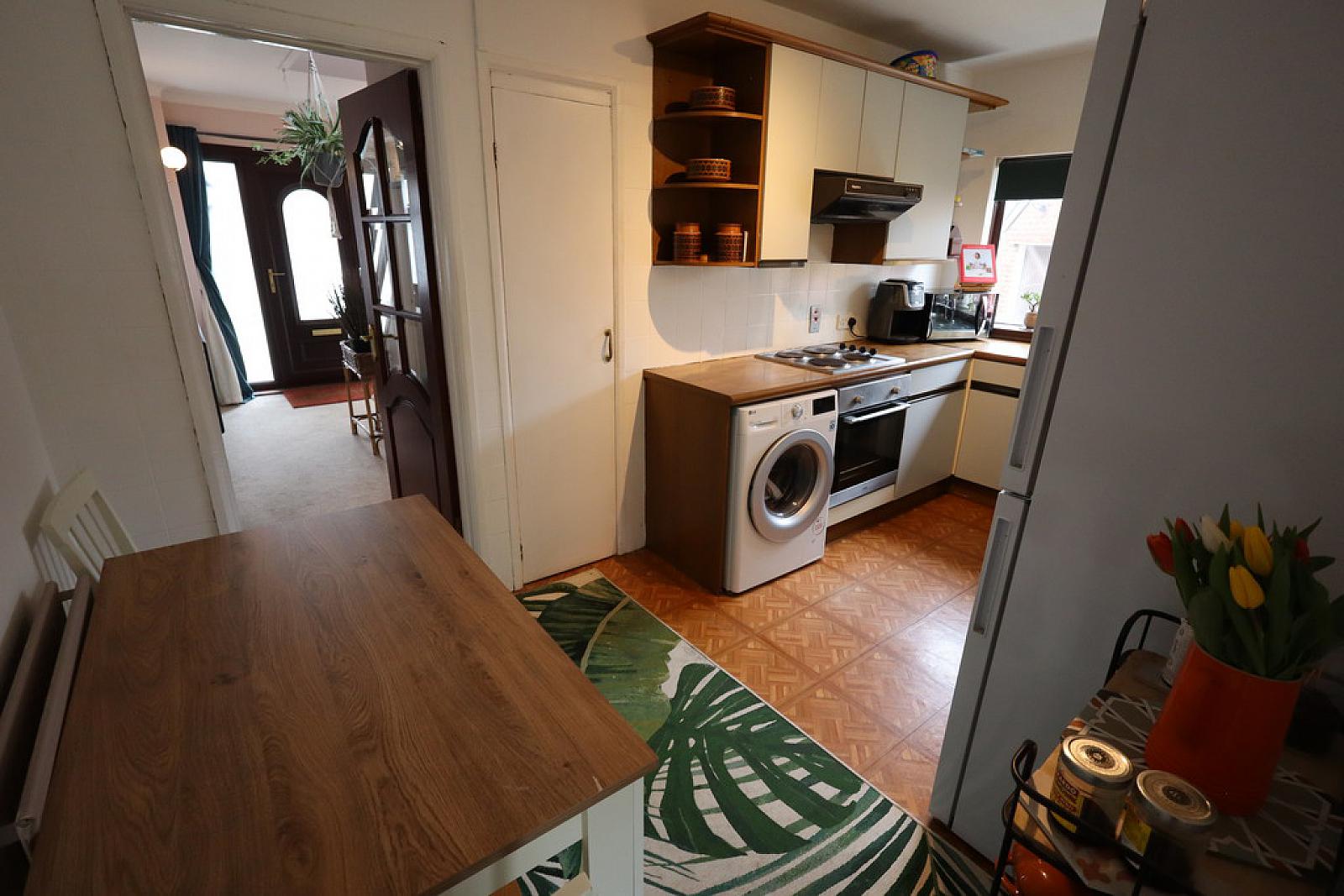 KITCHEN 14' 4" x 7' 9" (4.37m x 2.36m) Range of high and low level units, round edge worksurfaces, extractor hood, plumbed for washing machine, wall tiling, single drainer stainless steel sink unit with mixer tap