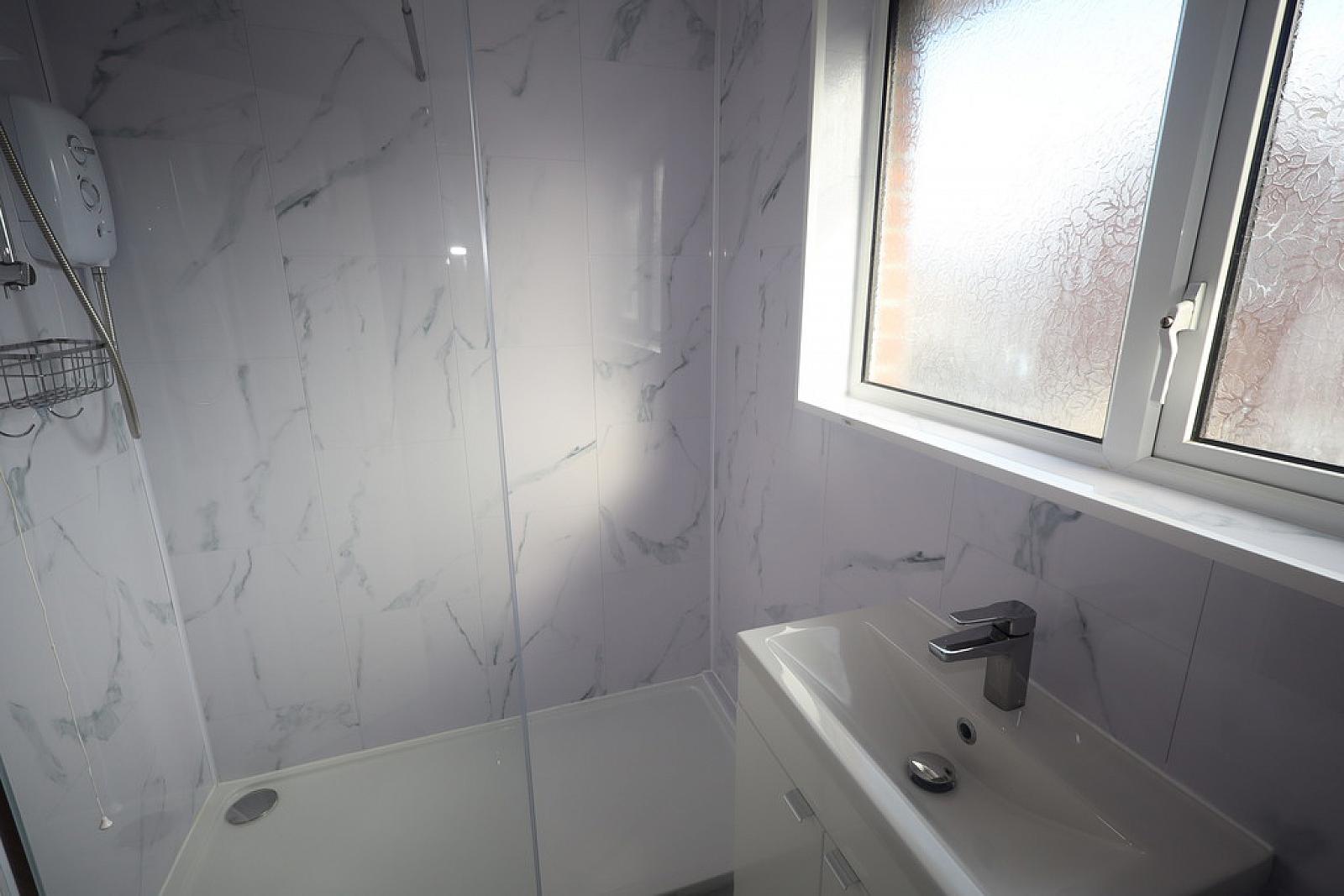 SHOWER ROOM Walk in shower unit, electronically controlled shower with chrome attachment. Low flush WC. Vanity unit with chrome mixer tap. uPVC panelled ceiling.
