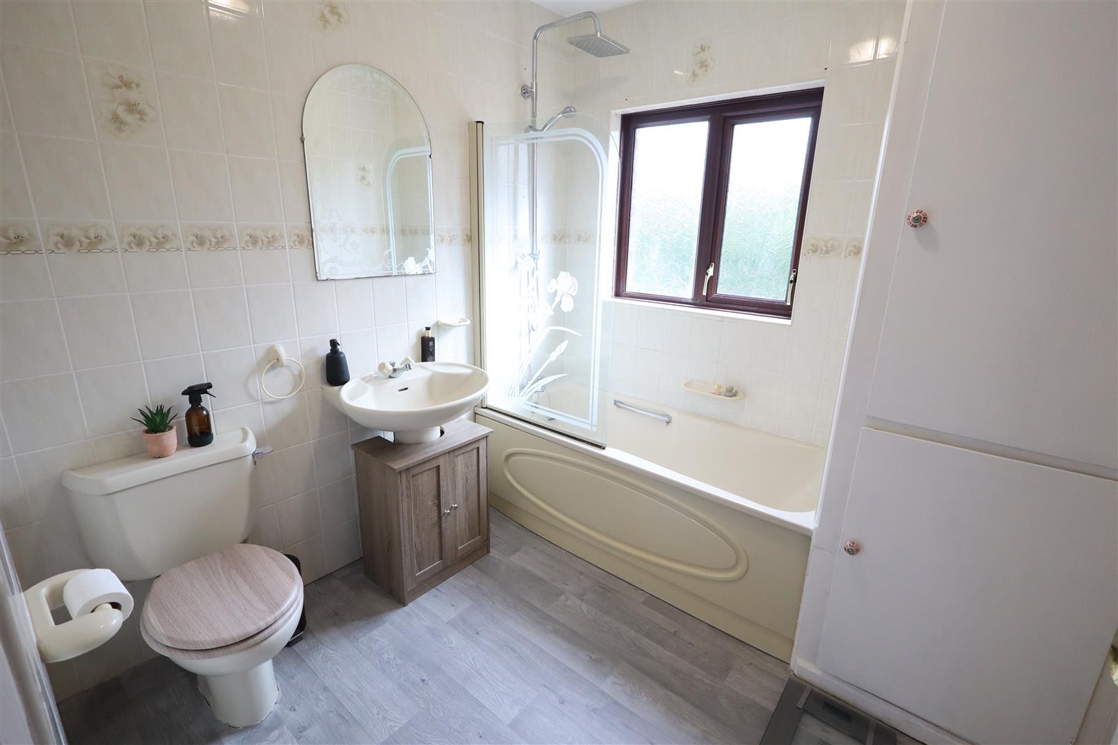 Panelled bath unit, controlled shower with rainwater effect shower head, glazed shower screen, wall tiling, low flush W/C, pedestal wash hand basin, linen cupboard