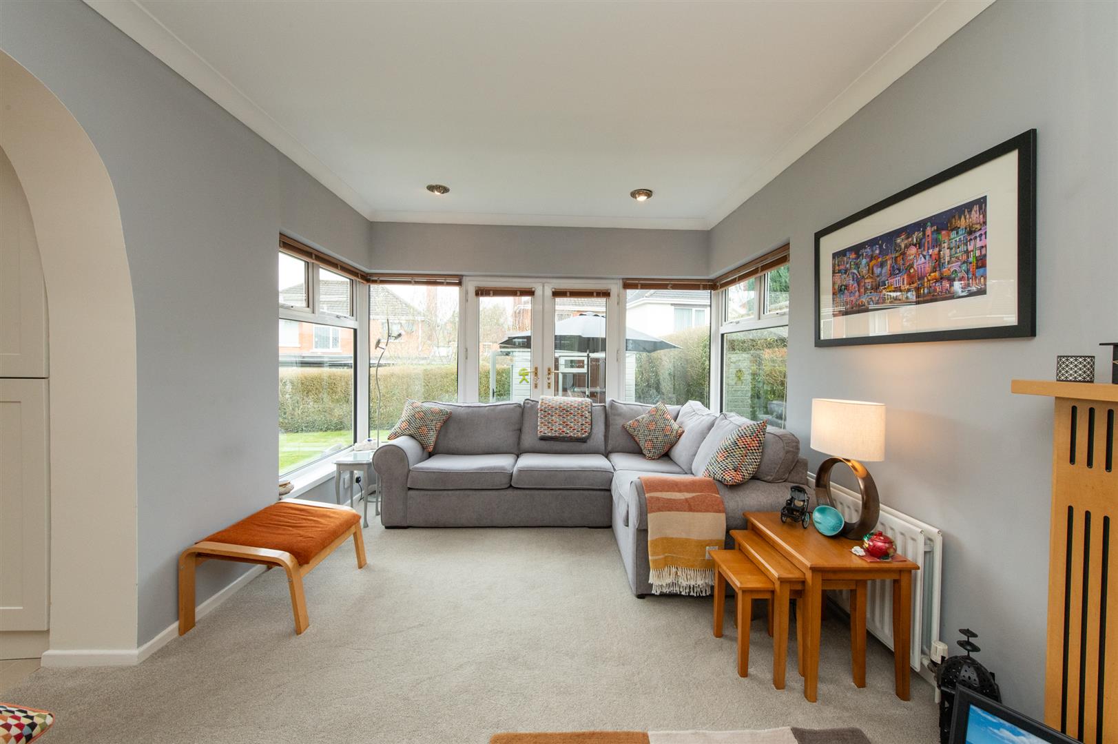 Feature gas fireplace with black granite inset and hearth. Cornicing. Downlighters. French doors to rear garden. Bi fold doors to lounge.
