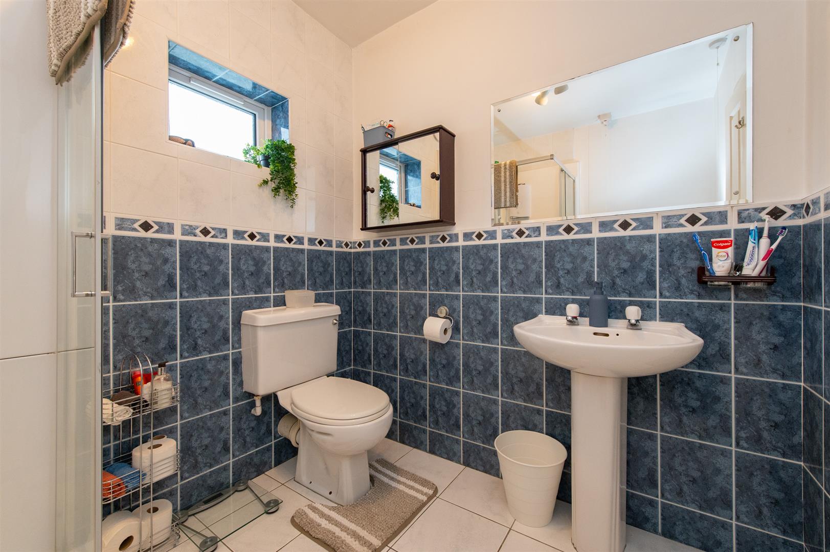 Shower unit with electric shower. Low flush WC. Pedestal wash hand basin. Wall mirror. Extractor fan. Wall tiling. Ceramic tiled flooring.