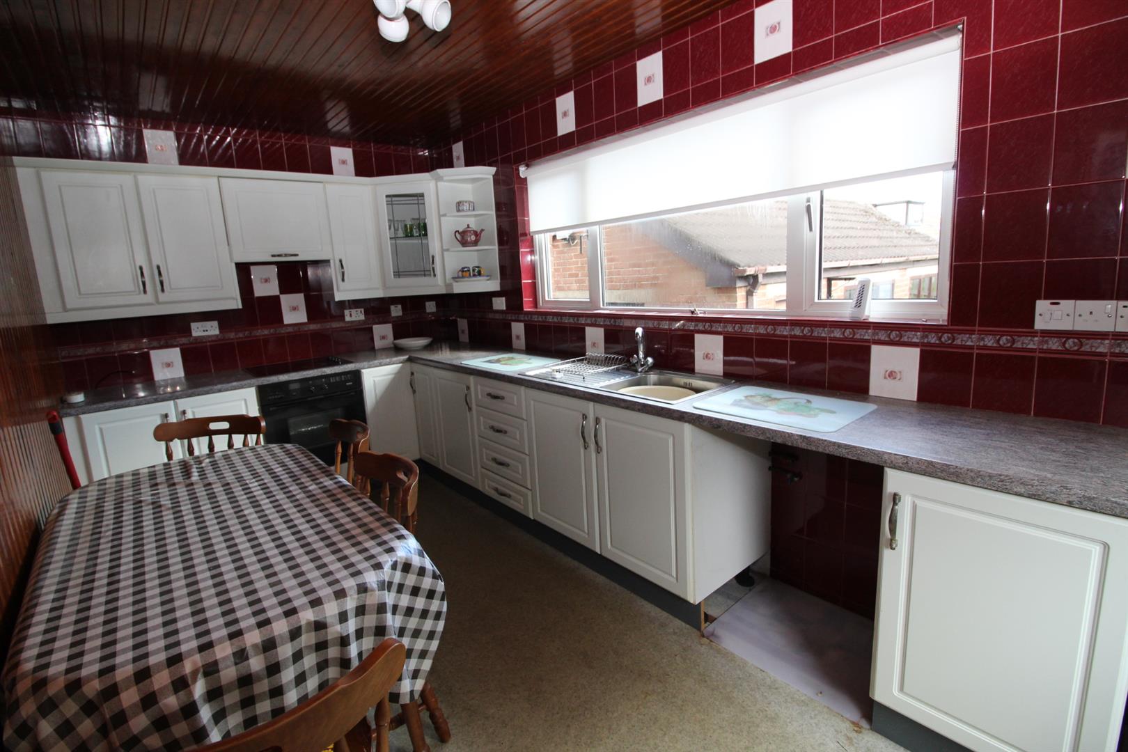 Range of high and low level units, round edge worksurfaces, single drainer stainless steel sink unit with mixer taps, built in oven and hob, extractor fan, wall tiling, wall panelling