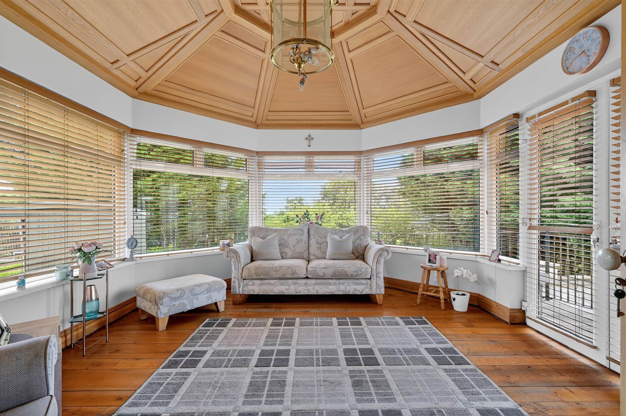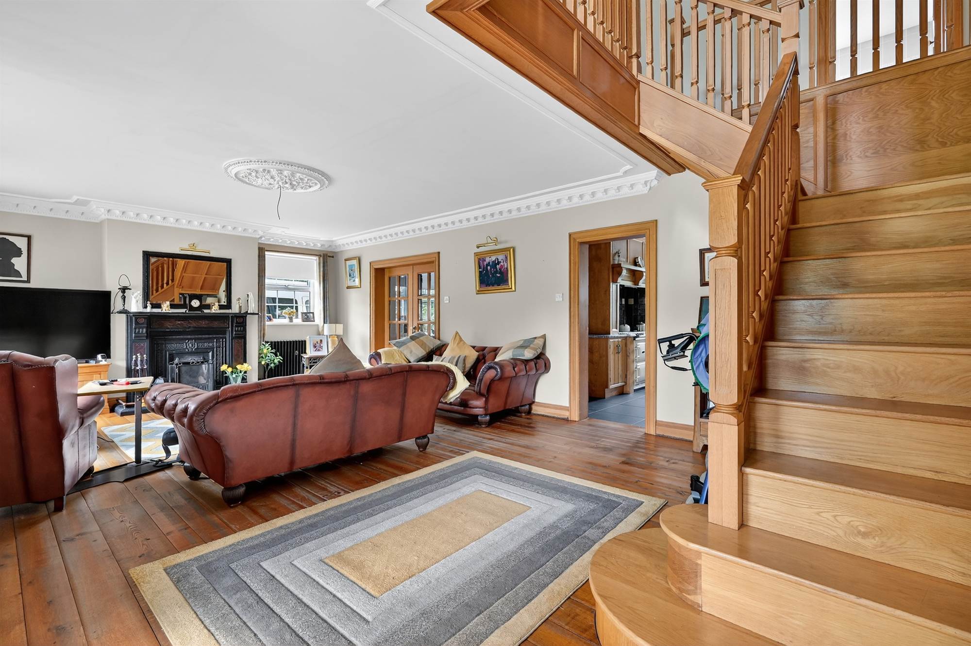 The accommodation is both spacious and flexible currently comprising three separate reception rooms, sun room, kitchen with casual dining area and six bedrooms, two with en suite shower rooms. Externally the property is secure and private, well screened from the road with a stoned wall entrance and electric gates, ample parking and gardens in lawn.