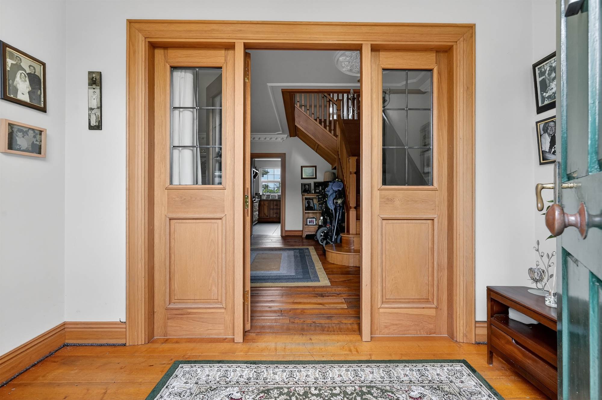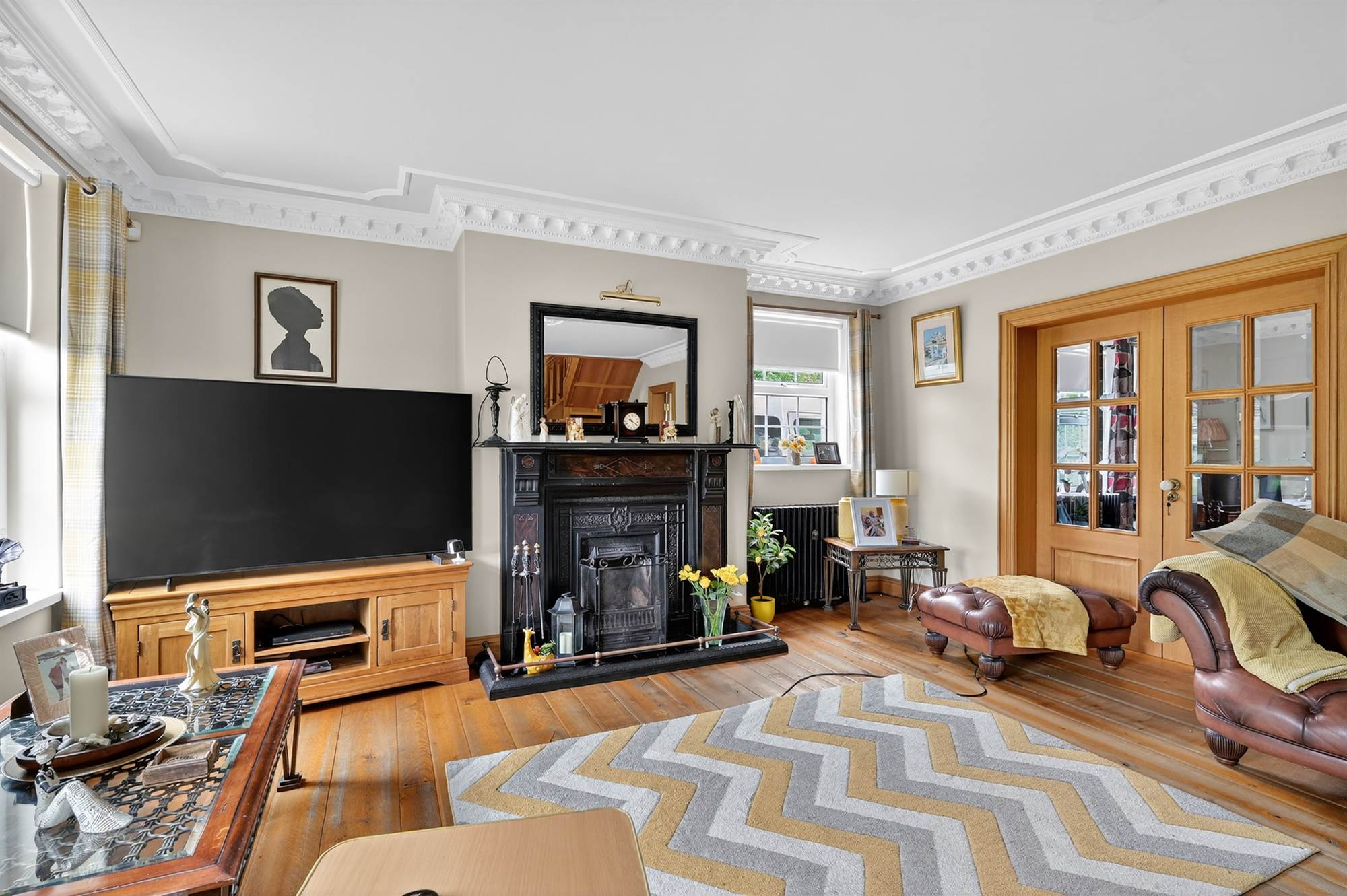 Reclaimed wooden floor, cornice ceiling and ceiling rose. Wooden and glazed double doors to . . .