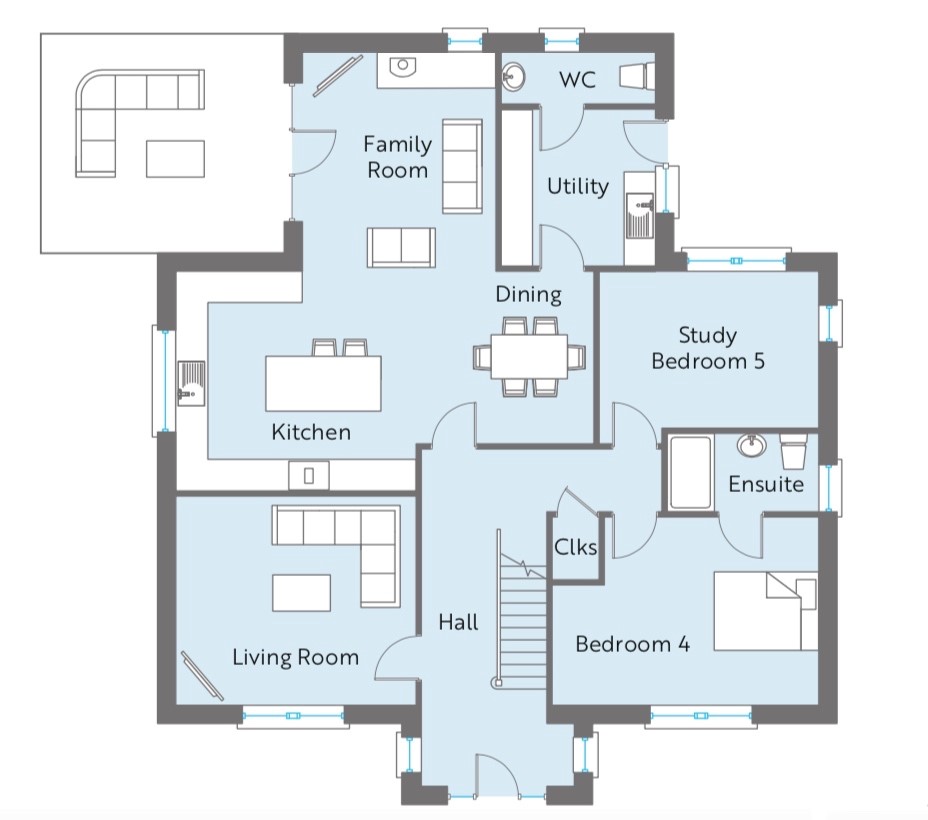 In addition to the main living room the property comprises a large open plan kitchen, family and informal dining area, together with the added bonus of a spacious utility complete with ground floor W/C.