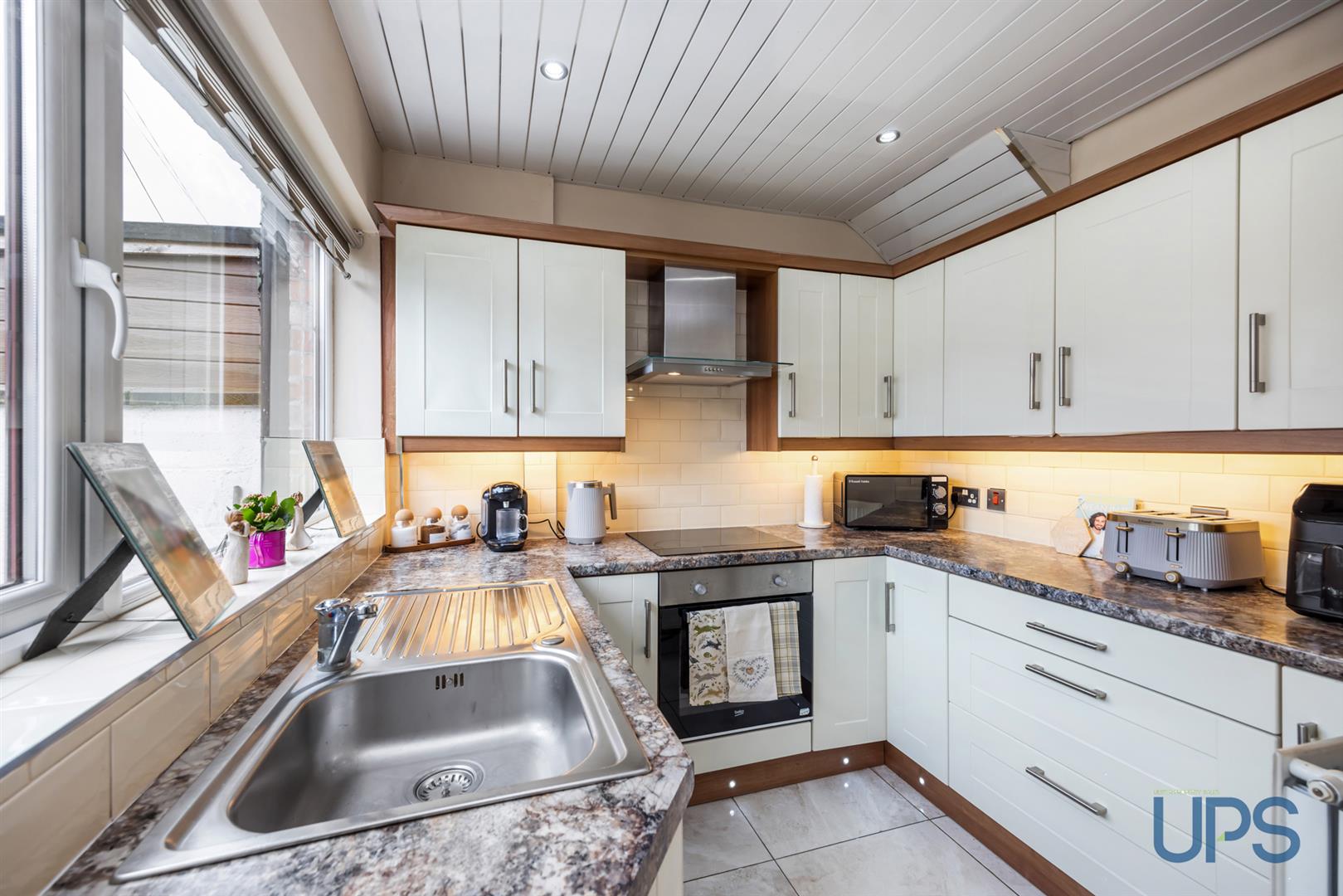 Range of high and low level units, feature work tops, 4 ring ceramic ho, under oven, over head extractor hood, plumbed for washing machine, single drainer sink unit, feature pvc ceiling, down lighters, ceramic tiled flooring, tiling.