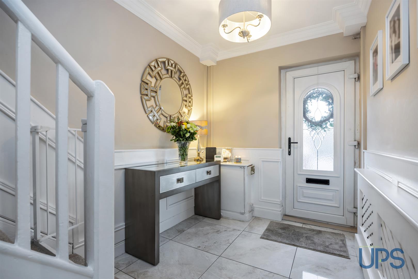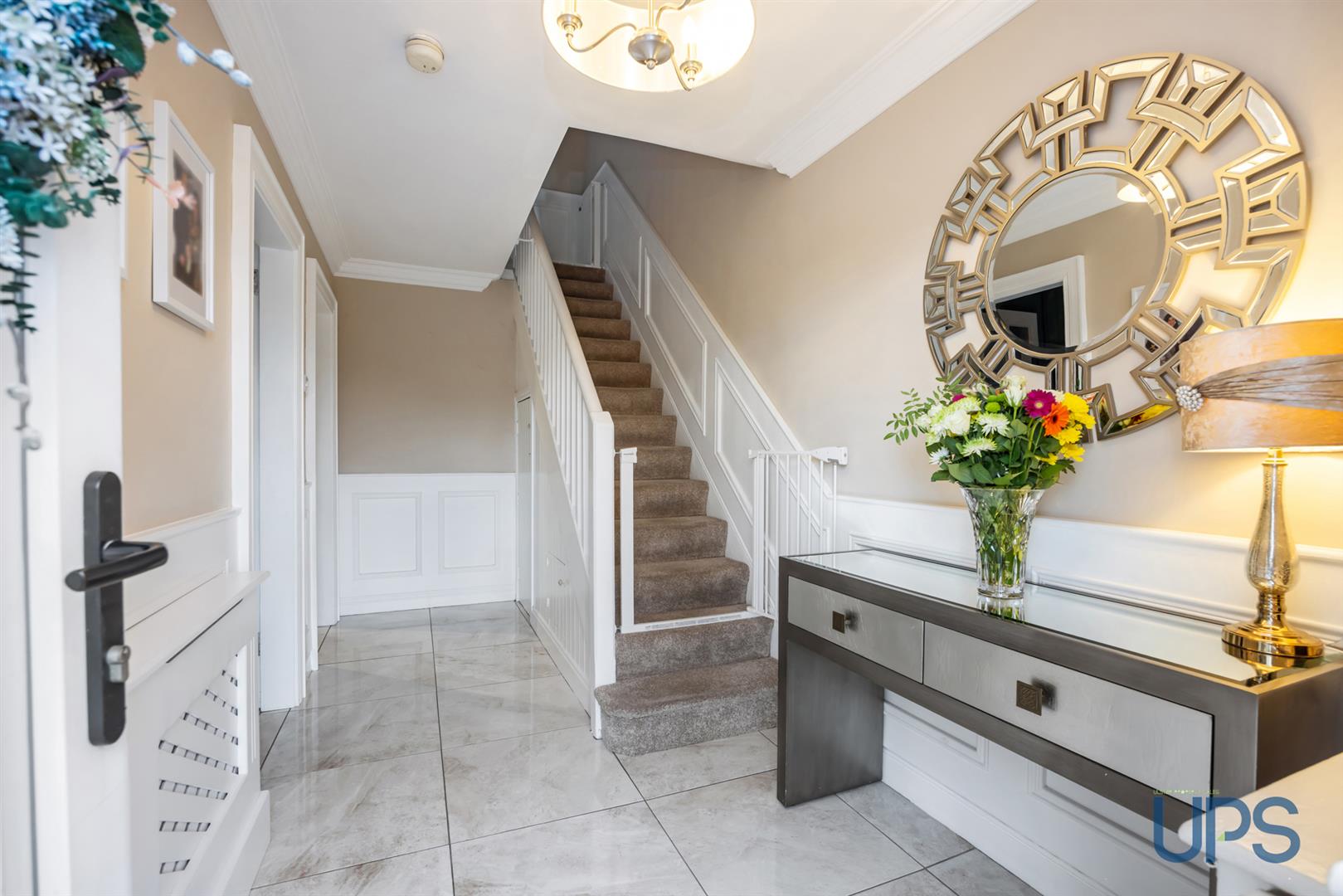 Ceramic tiled floor, feature wall paneling and cornicing.