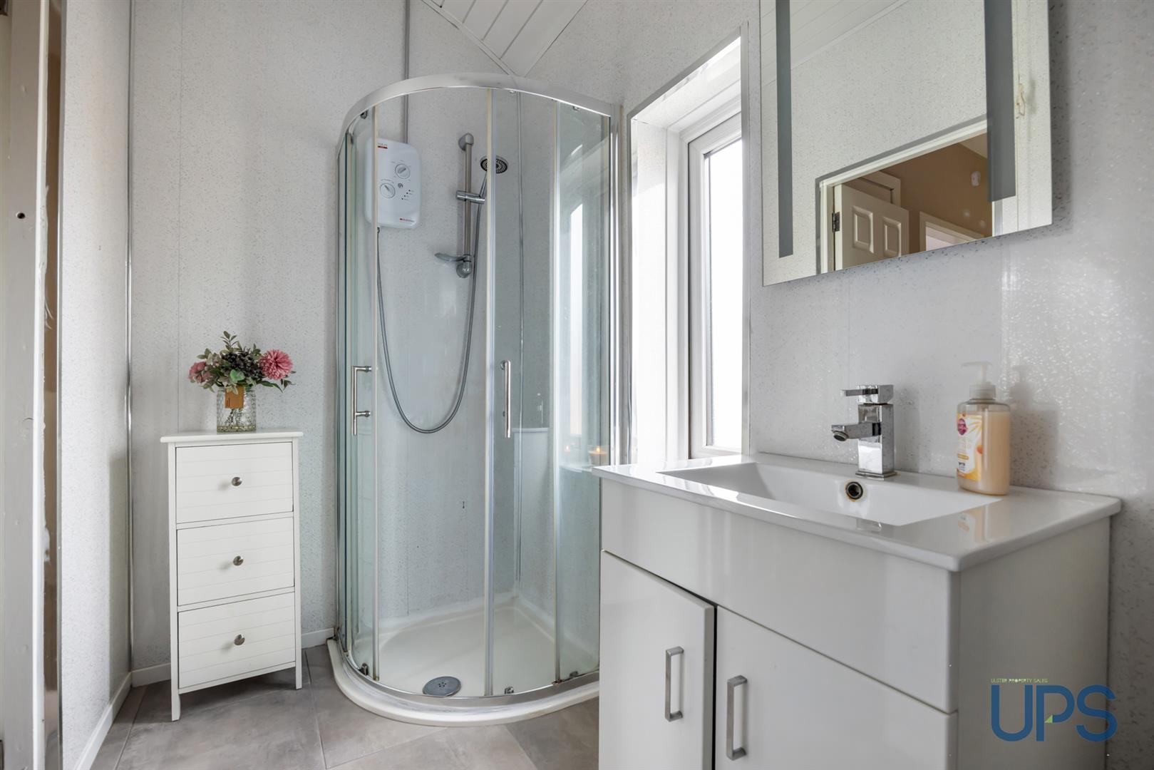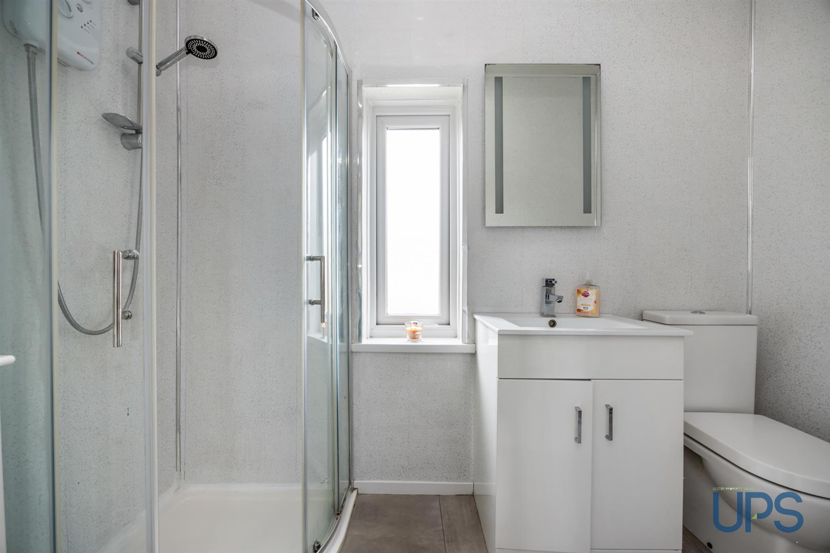 Shower cubicle, electric shower unit, wash hand basin, low-flush w.c, pvc wall and ceiling coverings, downlights, chrome effect towel warmer, ceramic tiled floor.