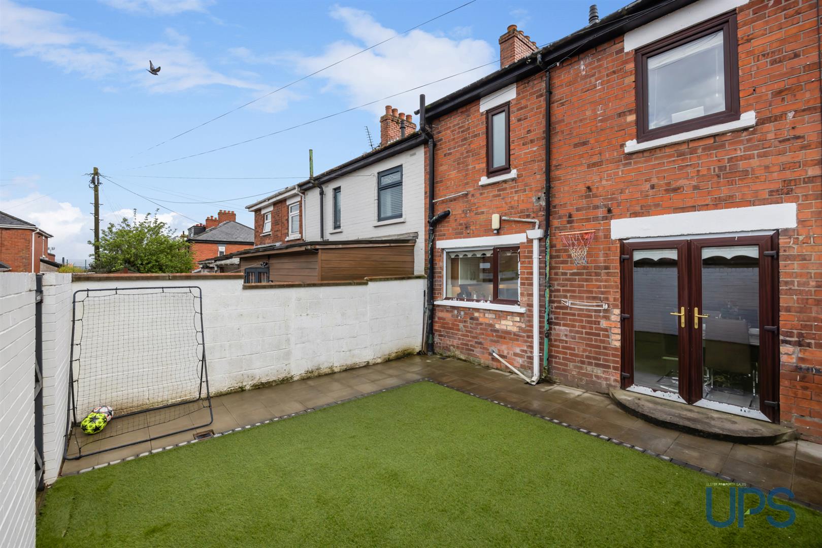 Rear enclosed and secure garden with artificial grass. Car parking and double gates to front.