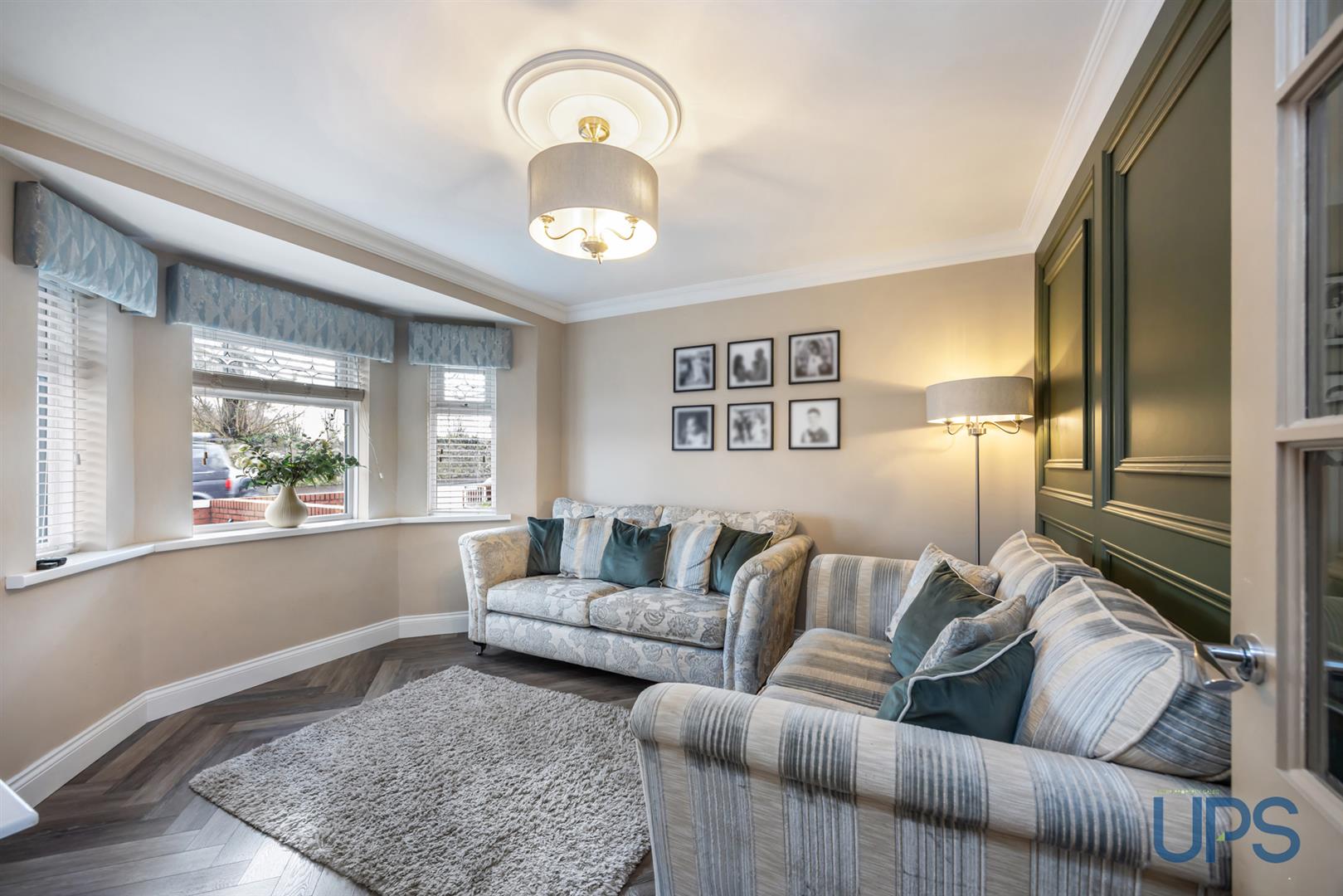 Bay window, wood effect stripped floor, feature wood paneling, cornicing.