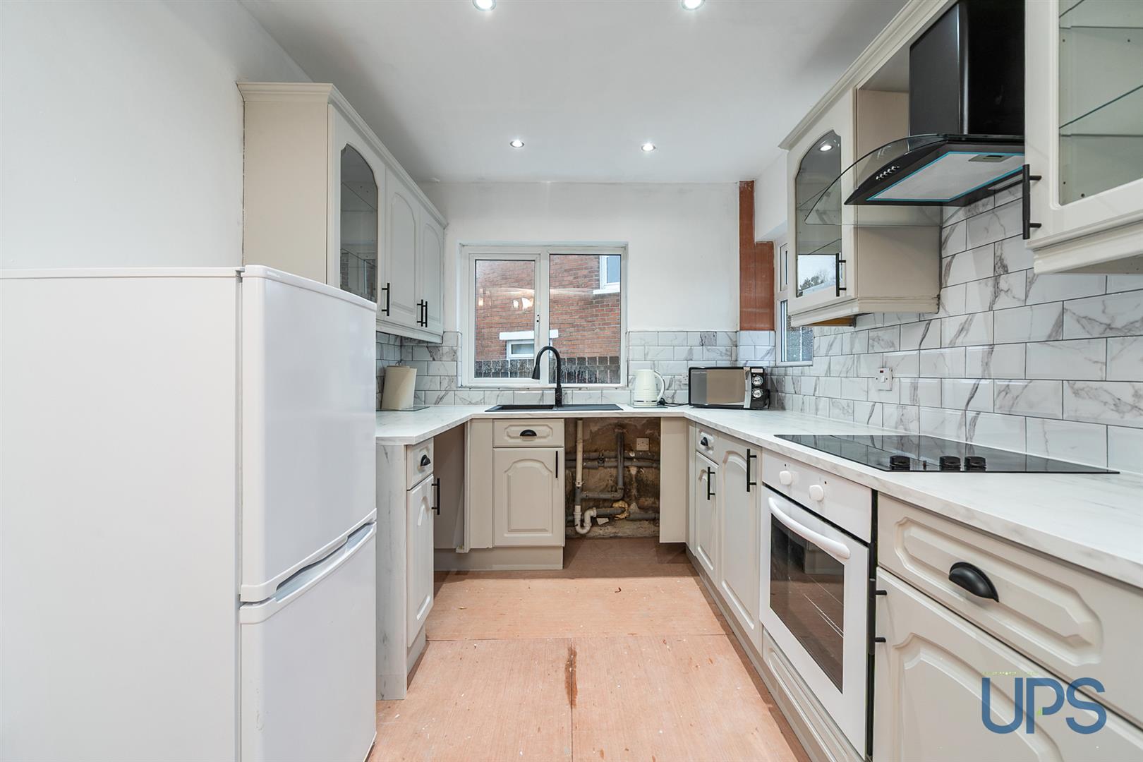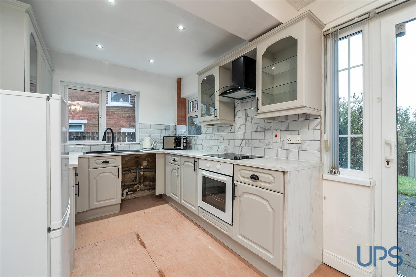 Range of high and low level units, Formica work surfaces, modern sink unit, overhead extractor hood, feature hob, plumbed for washing machine and dishwasher, feature patio doors, garden access.