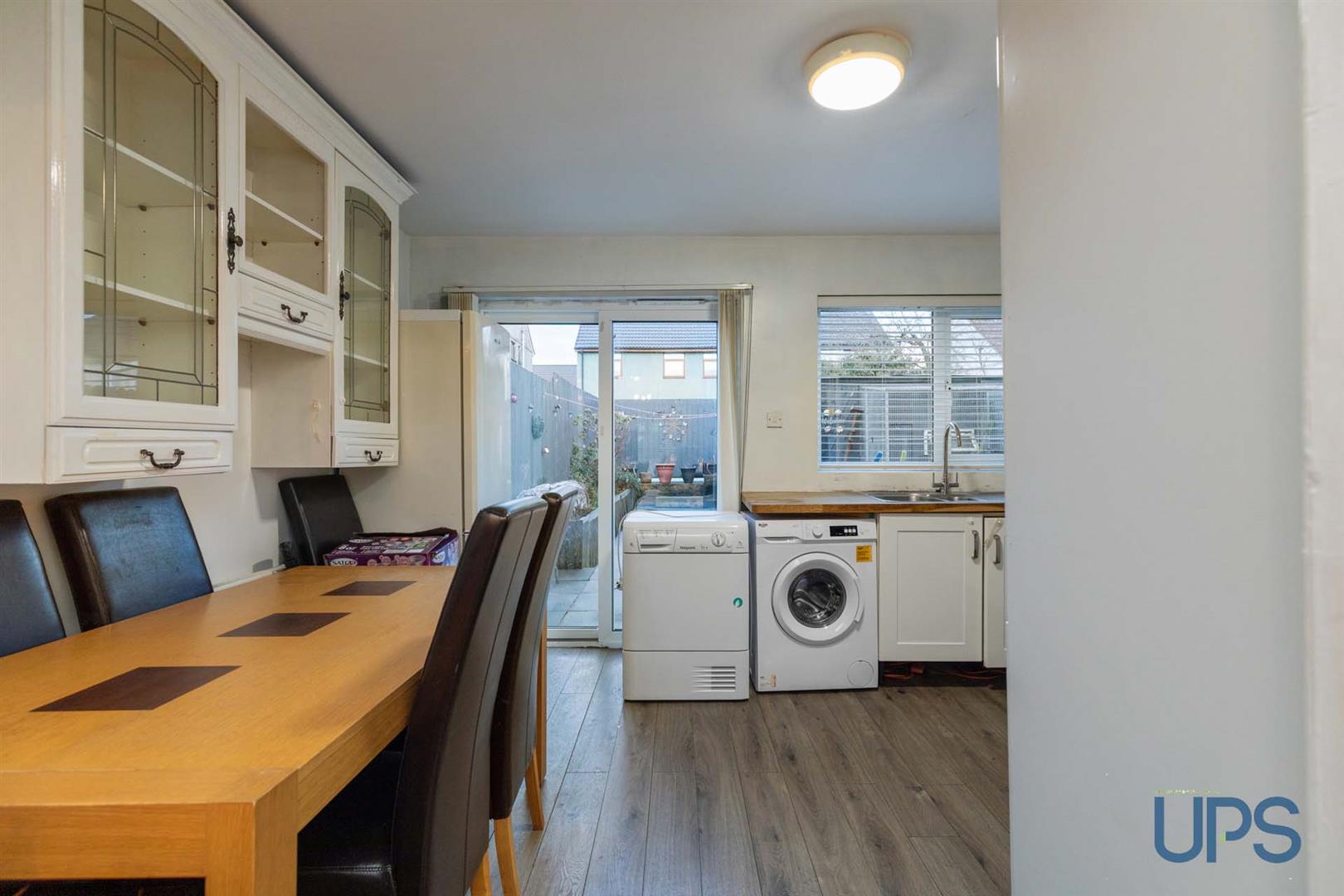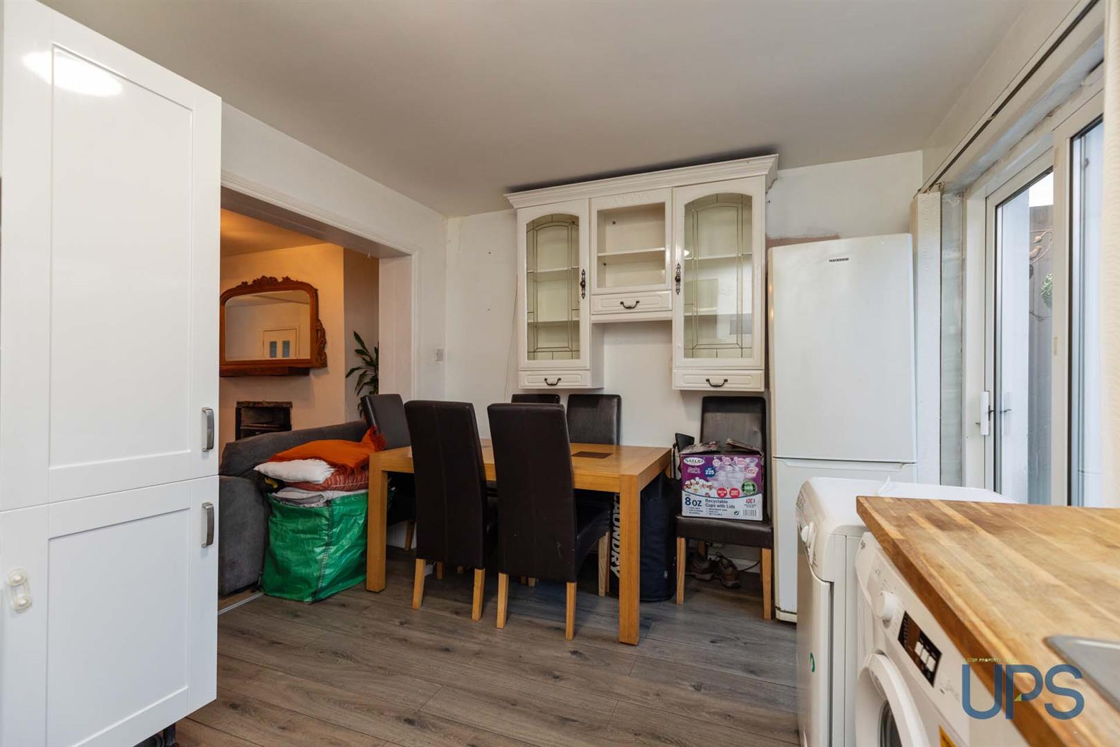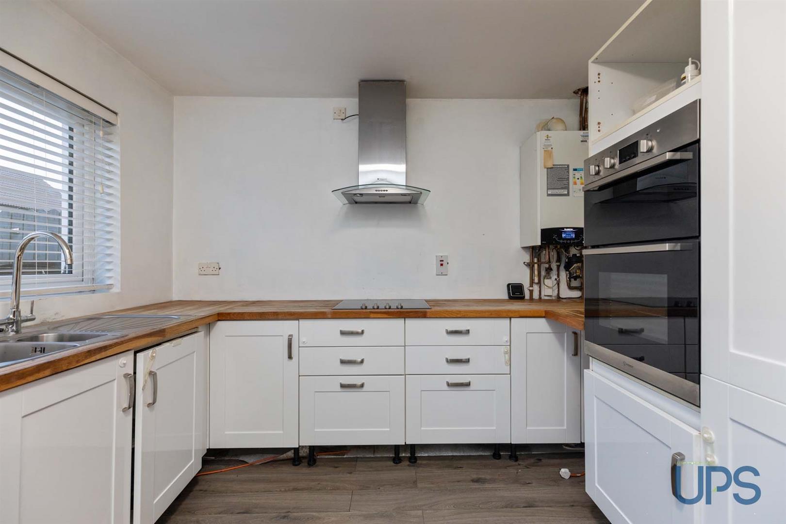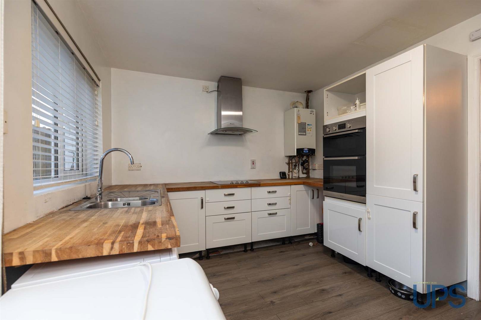 Bowl 1/2 stainless steel sink unit, range of low level units, solid wood worktops, built-in double oven, ceramic hob, stainless steel canopy extractor fan, fridge/freezer space, plumbed for washing machine, larder cupboard, wood laminate floor, double panelled radiator, wall mounted gas boiler, upvc slide doors to rear.