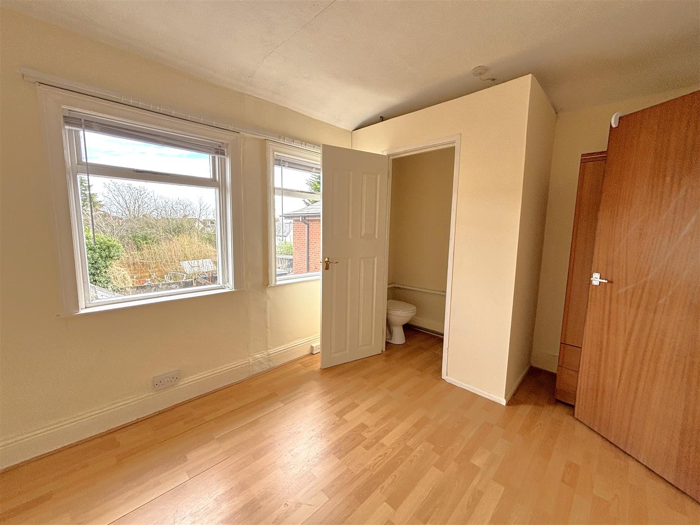 At widest, wood laminate floor, built-in storage, panelled radiator.