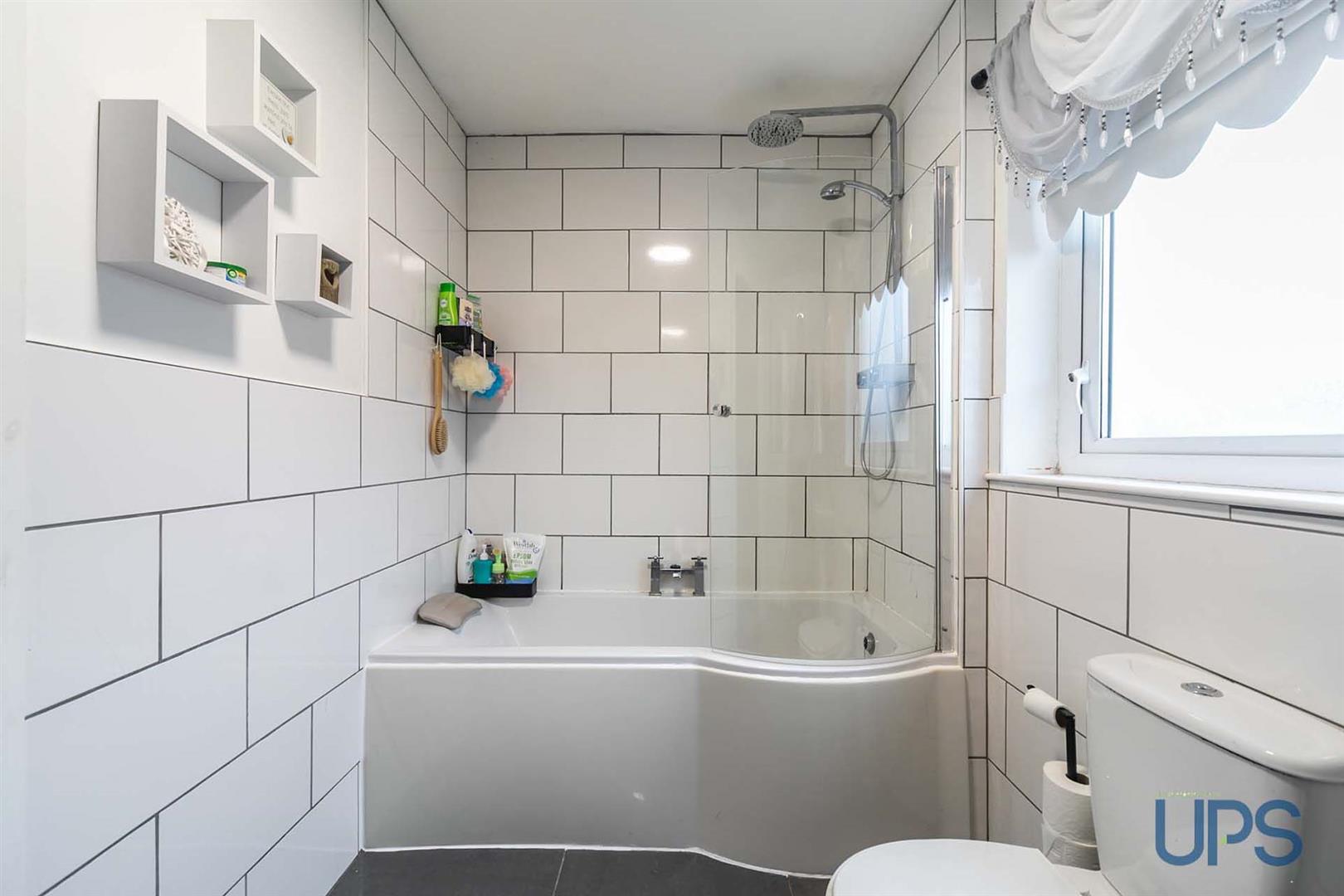 Deluxe fully tiled white suite comprising panelled bath, shower screen, thermostatic controlled drench shower, vanity unit, low flush wc, tiled walls, ceramic tiled floor.