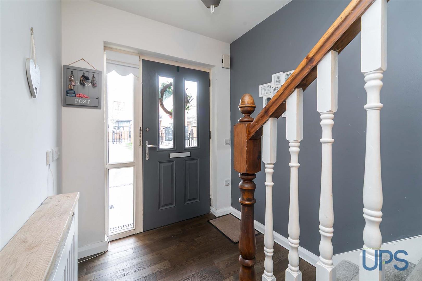 UPvc double glazed entrance door, under stairs storage, wood laminate floor, panelled radiator.