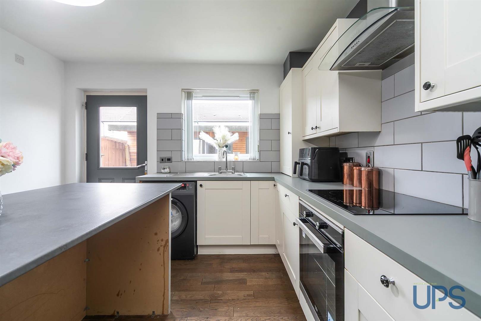 Single drainer stainless steel sink unit, extensive range of high and low level units, formica worktops, island unit, built-in under oven and hob, stainless steel canopy extractor, fridge freezer space, plumbed for washing machine, partially tiled walls, wood laminate floor.