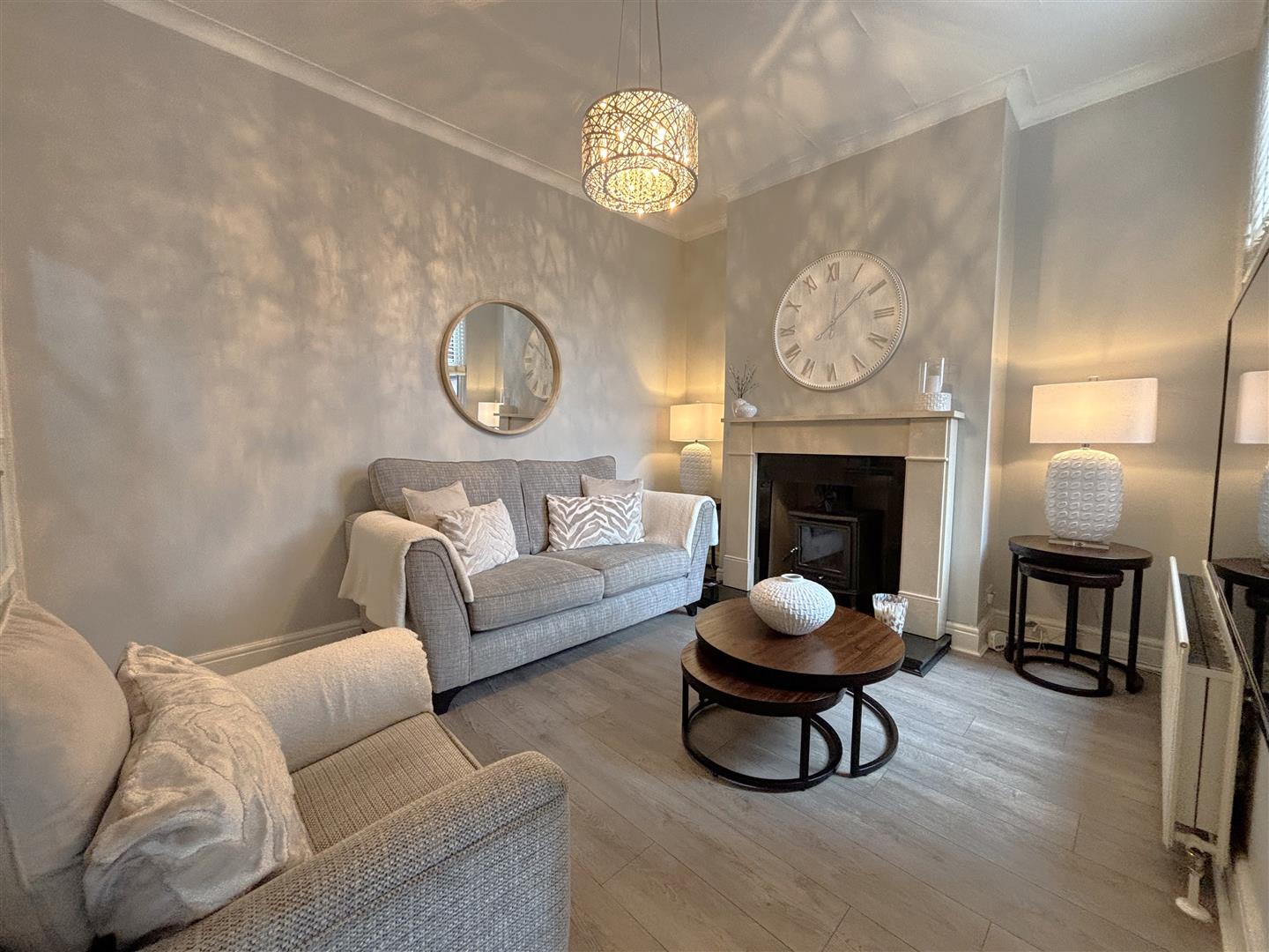 Wood laminate floor, stone fireplace with wood burning stove, double panelled radiator.