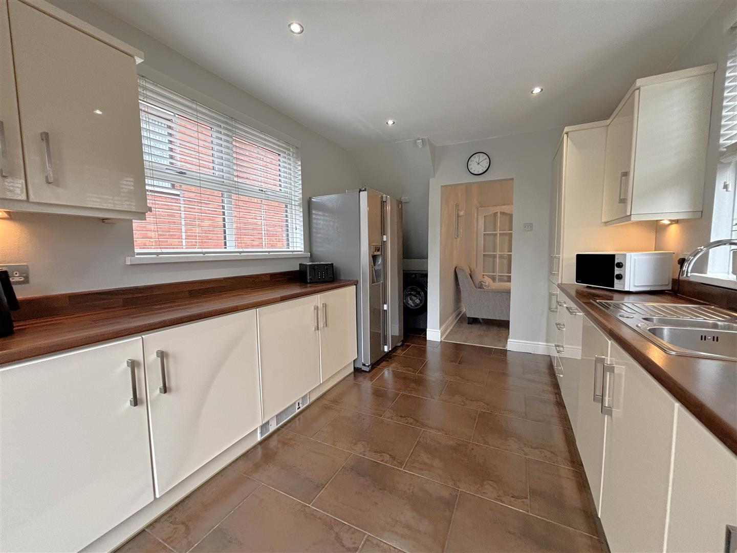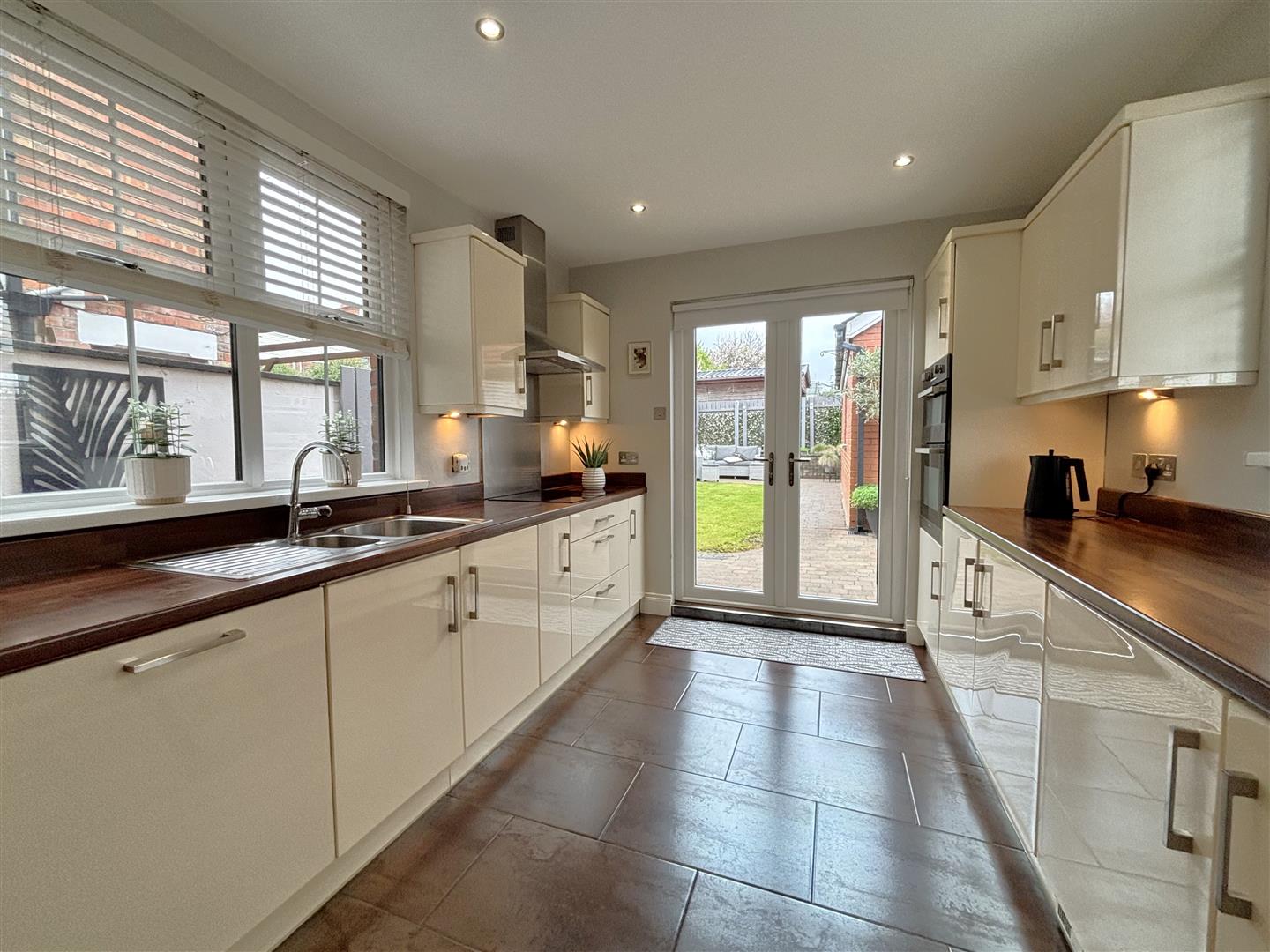 Bowl and a half stainless steel sink unit, extensive range of high and low level units, formica worktop, built-in high level double oven and ceramic hob, stainless steel canopy extractor fan, stainless steel splash back, integrated dish washer, plumbed for washing machine, American fridge/freezer space, partially tiled walls, ceramic tiled floor, wall mounted gas boiler, panelled radiator, recessed lighting, uPvc double glazed patio doors.