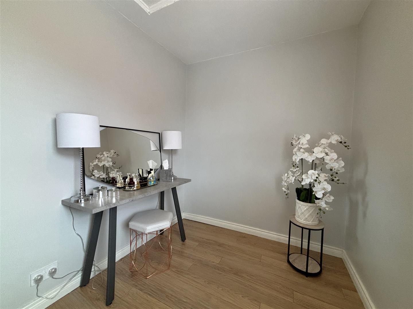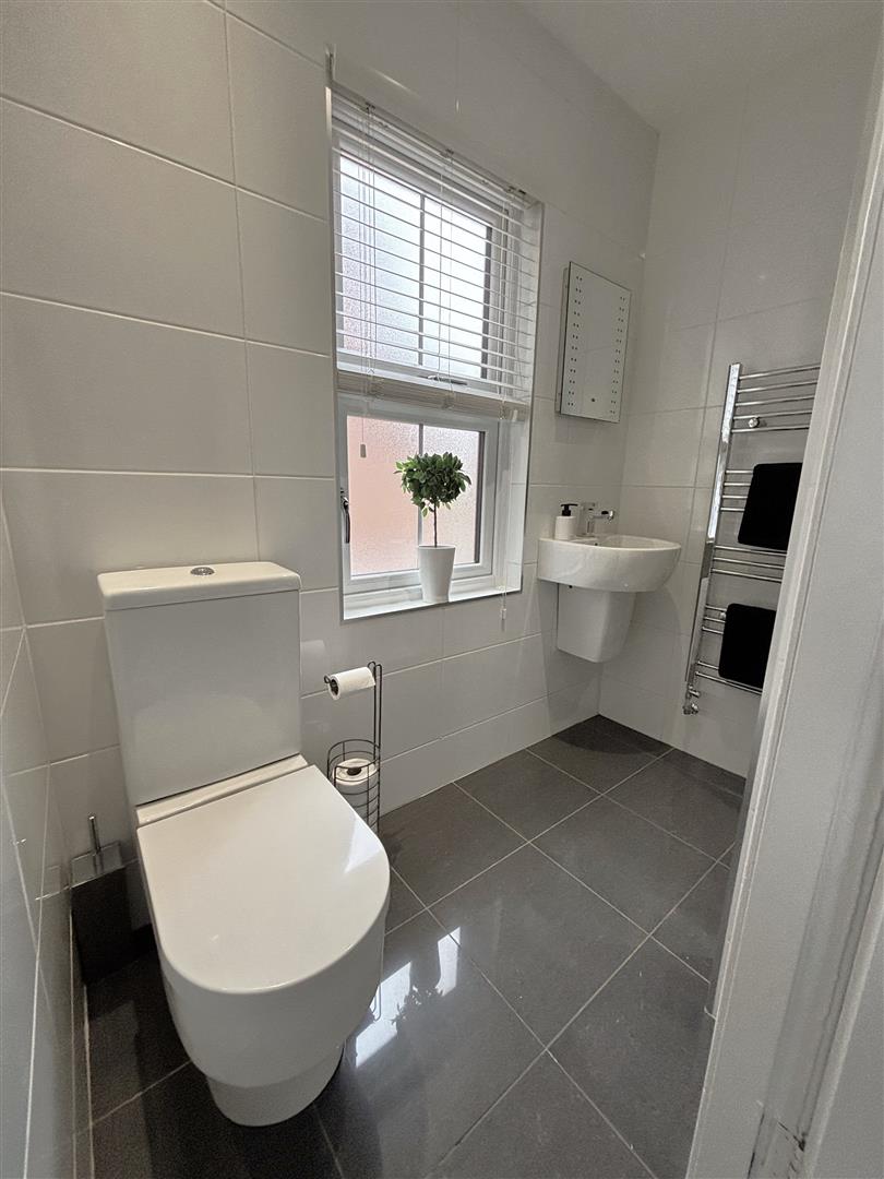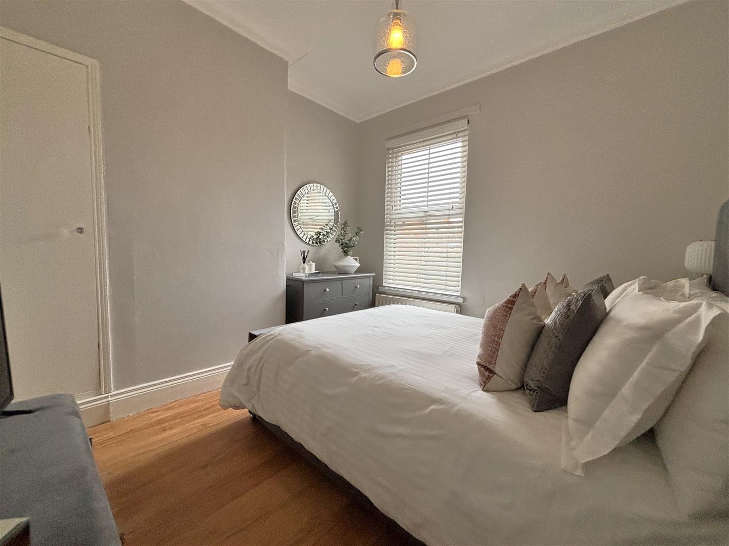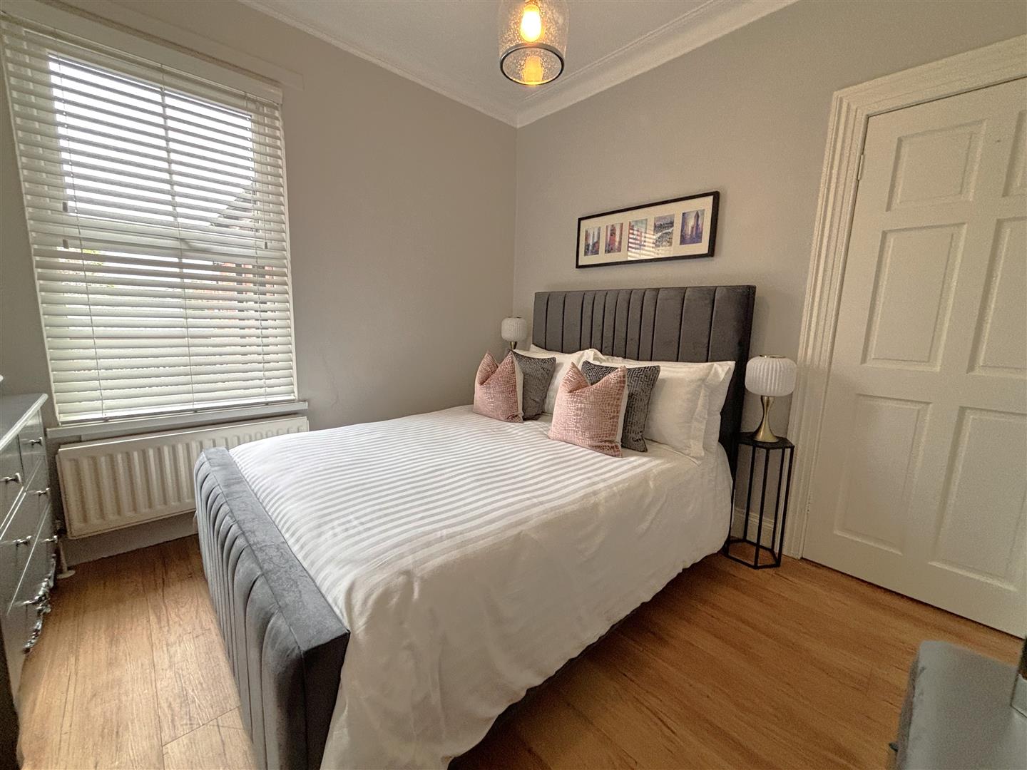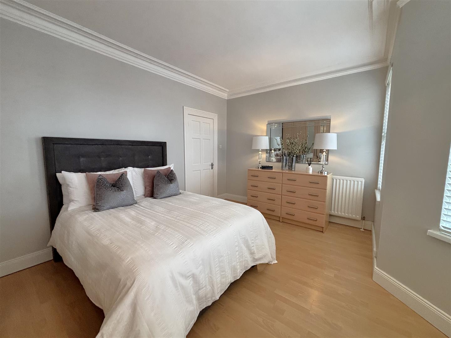 Wood laminate floor, cornice ceiling, double panelled radiator.