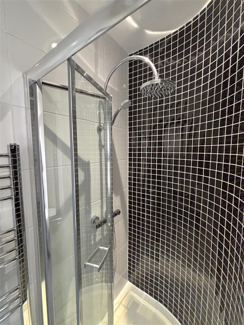 Fully tiled deluxe white suite comprising shower cubicle, thermostatic controlled drench style shower, telephone handset shower, wash hand basin, low flush wc, fully tiled walls, recessed lighting, chrome radiator.