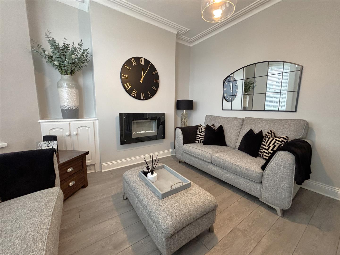 Into bay, wood laminate floor, wall mounted electric fire, double panelled radiator.