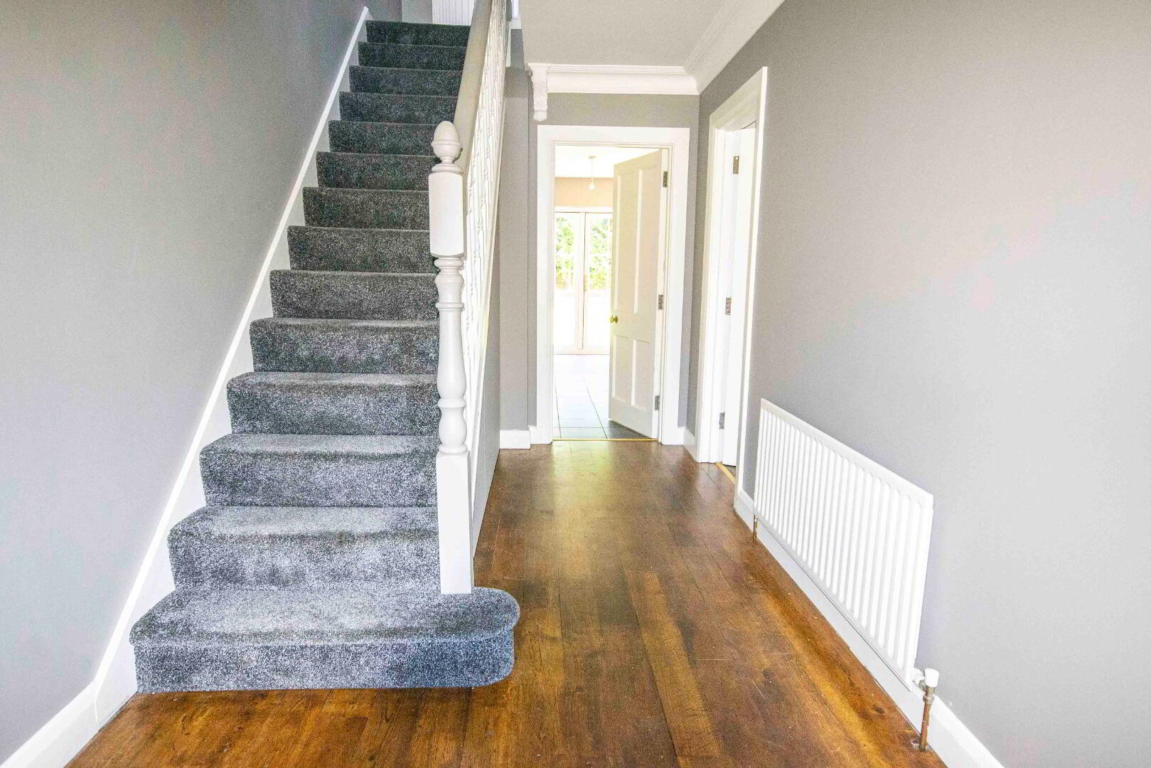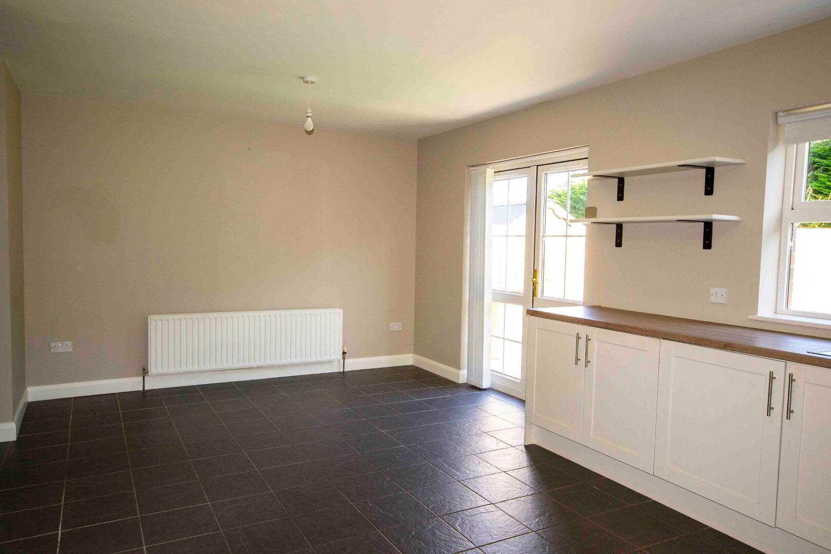 Hallway, living room, kitchen/dining room, W.C., utility room, Patios doors leading to paved patio and enclosed back garden.