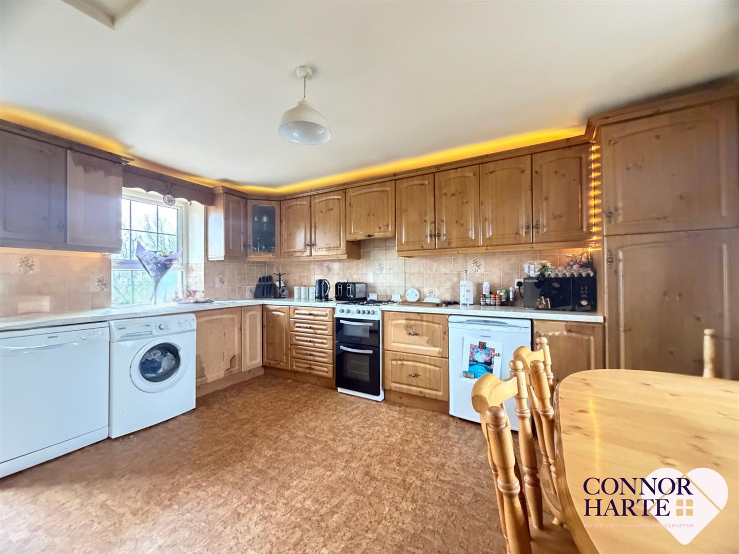 Fitted kitchen with high and level units. Power points. Central heating clock. Plumbed for dishwasher and washing machine. Space for cooker and undercounter fridge. Single bowl stainless sink unit. Vinyl flooring. Power points. P.V.C. exterior door.
