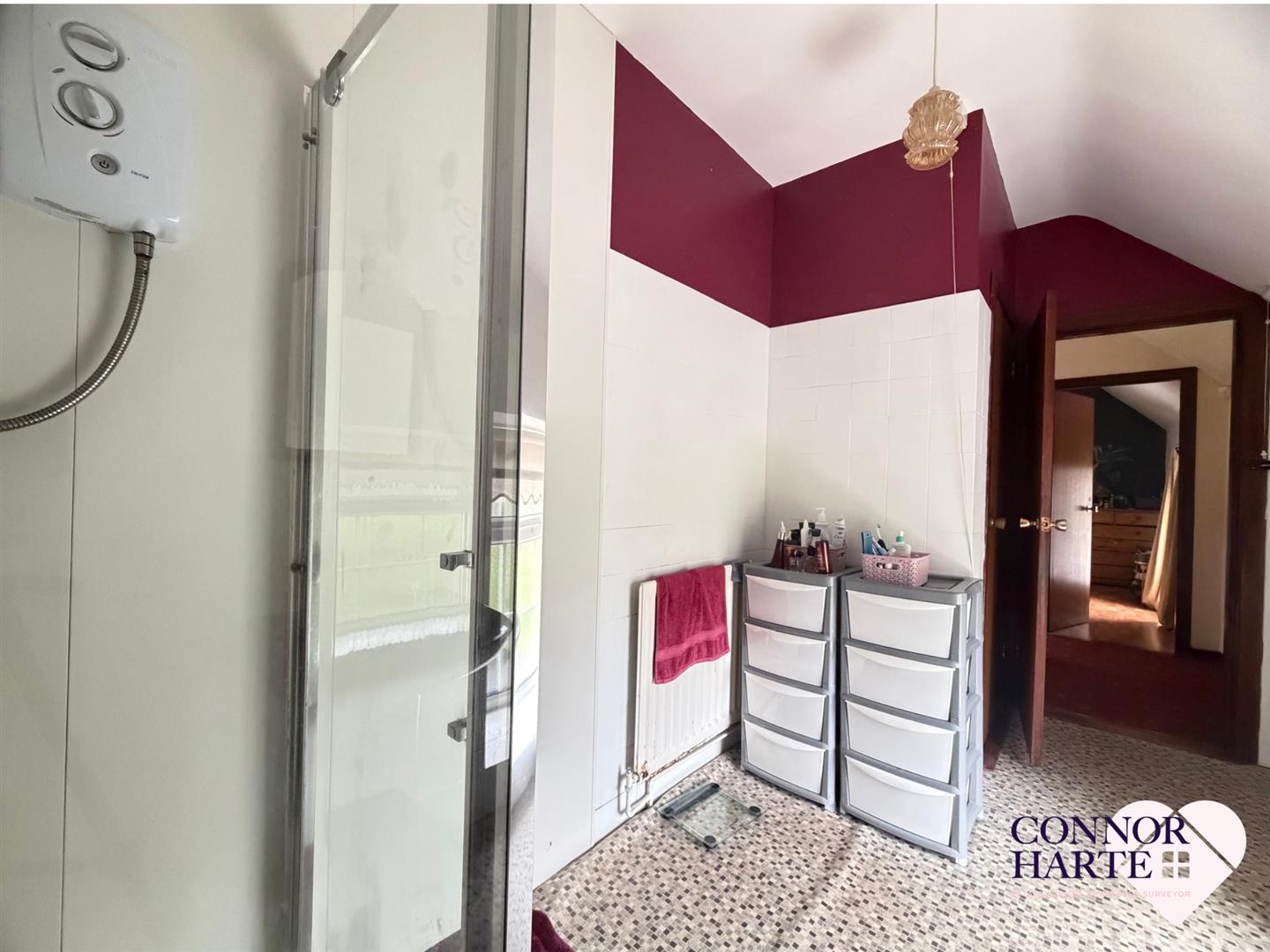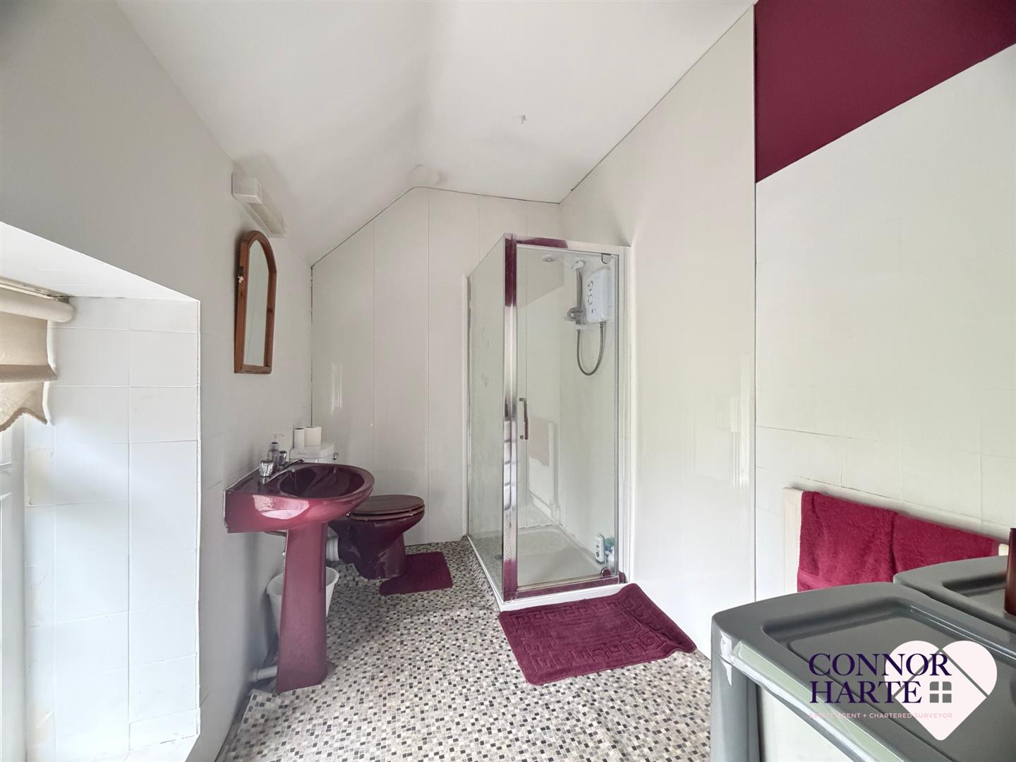 Coloured suite. Low flush wc and pedestal wash hand basin. Shower cubicle with Triton shower. P.V.C. panelling. Part tiled walls and part P.V.C. wall panelling. Vinyl flooring.