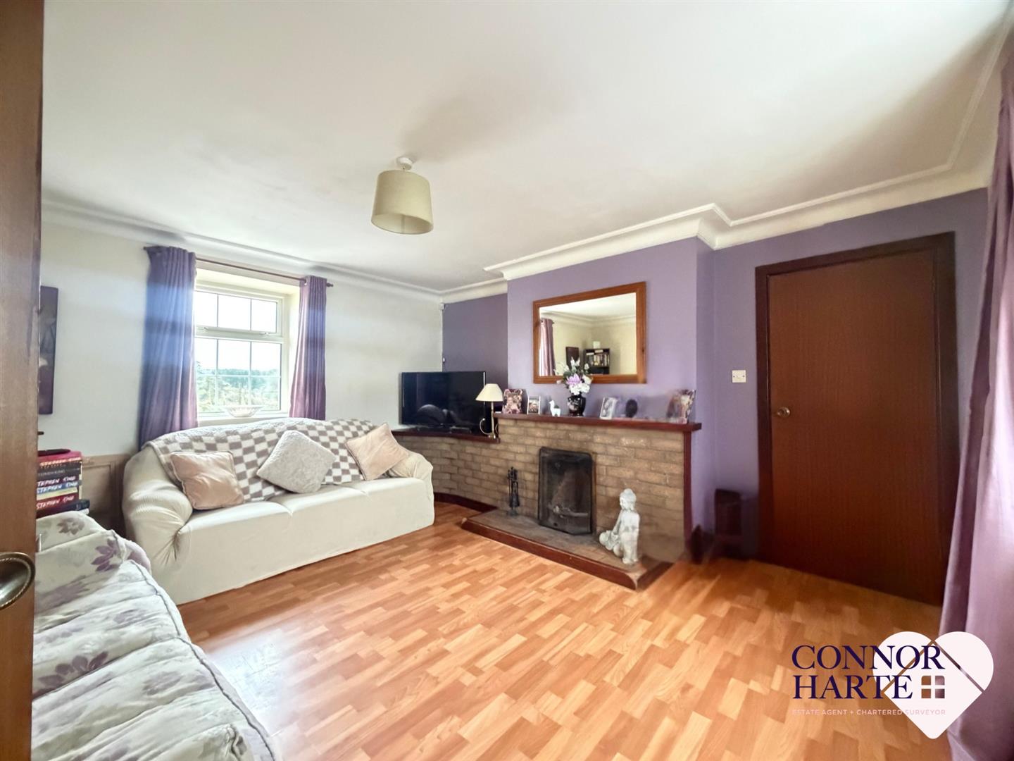 Open fire with brick fireplace surround and hearth. Mahogany mantle. Built in brick television area. Laminated wooden floor. Television and power points. Moulded cornicing.