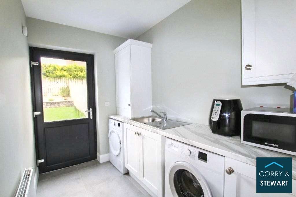 11’0” (Longest Point) x 5’10’’ (Widest Point) Fitted High And Low Level Units. Tiled Flooring. Plumbed For Washing Machine And Tumble Drier. Sink Unit. PVC Exterior Door With Glazed Panel.