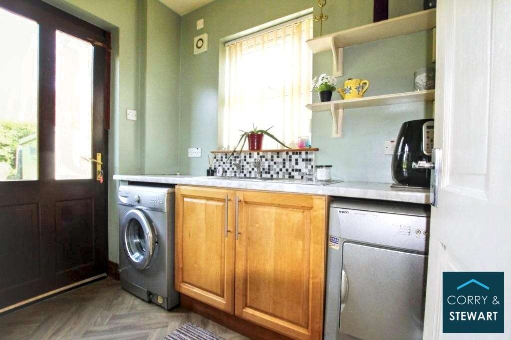 7’11” (Longest Point) x 5’02” (Widest Point) Fitted High And Low Level Units. Vinyl Flooring. Part Tiled Walls. Plumbed For Washing Machine And Tumble Drier. Sink Unit. Wooden Exterior Door With Glazed Panels. Cloak Room Off.