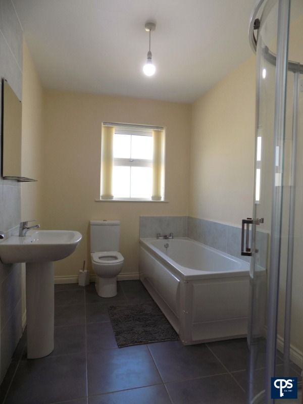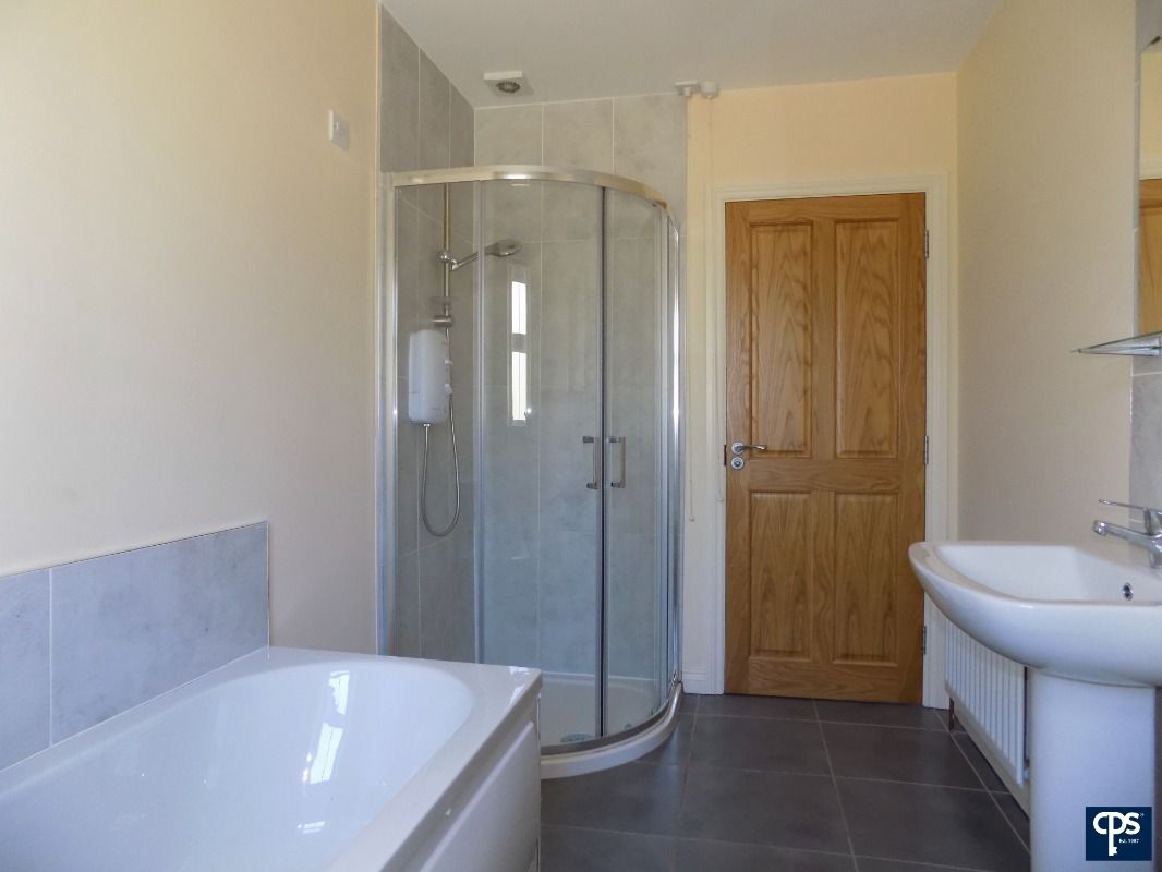 White suite comprising, toilet, basin, pedestal, panel bath and separate electric shower. Tile flooring with partial wall tiling.