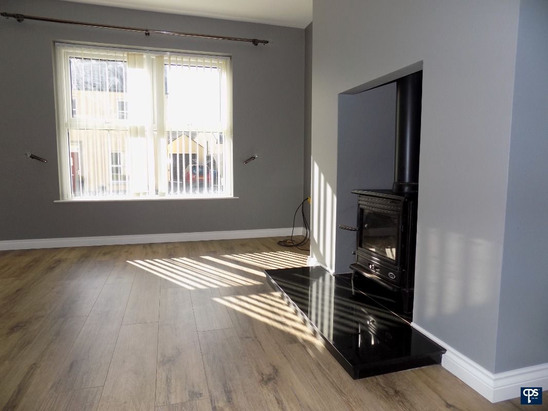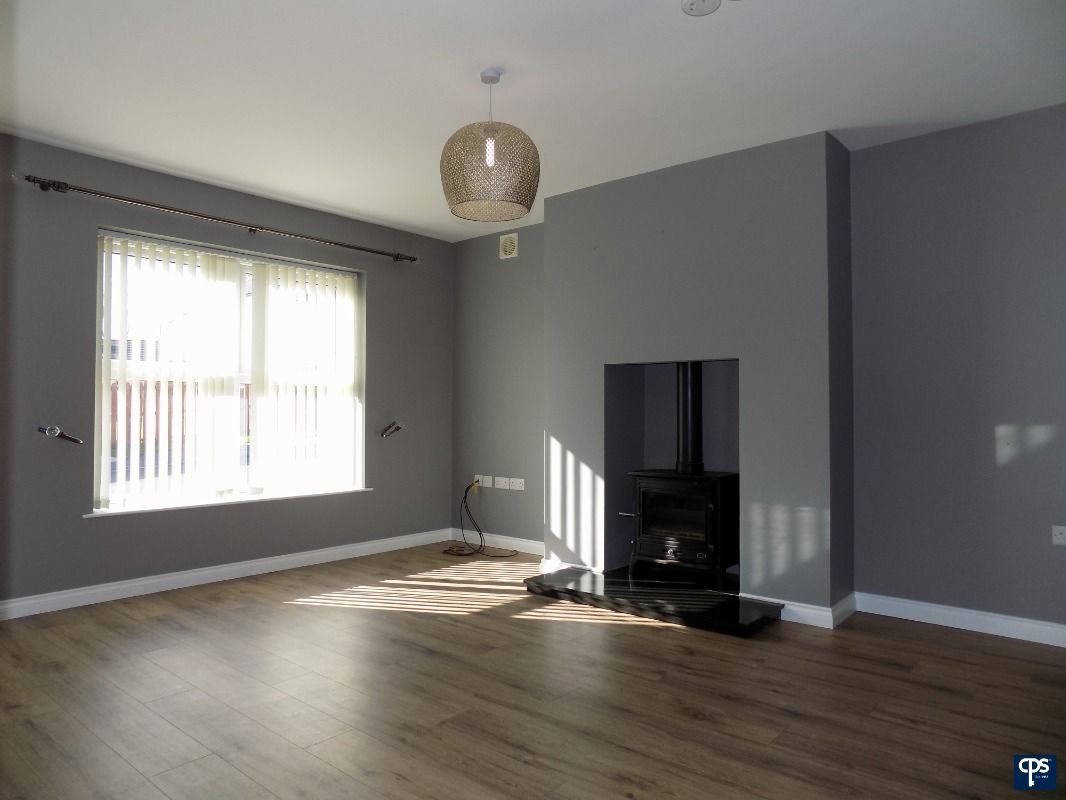 Spacious living room with inset solid fuel burning stove. Laminate wooden flooring.