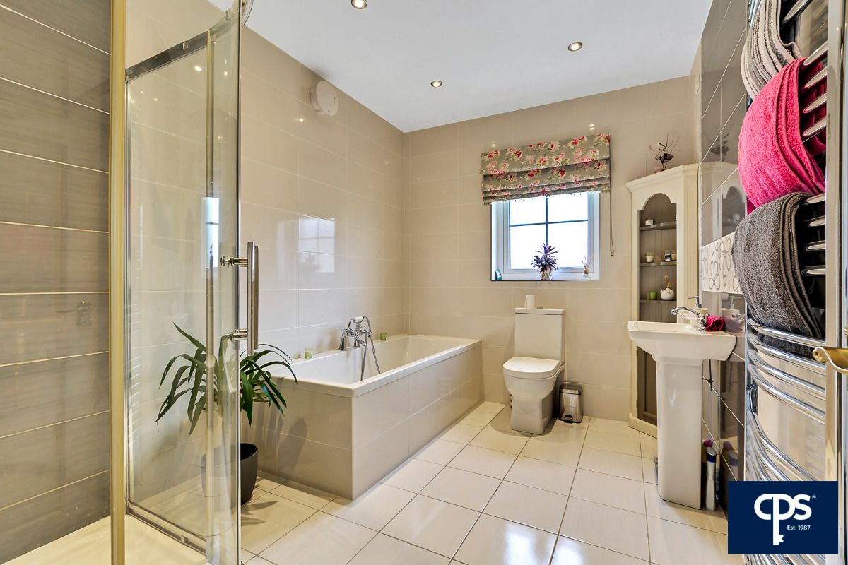 Contemporary bathroom suite comprising toilet, basin, pedestal, bath tub, separate corner shower & heated towel rail. Floor and wall tiling.