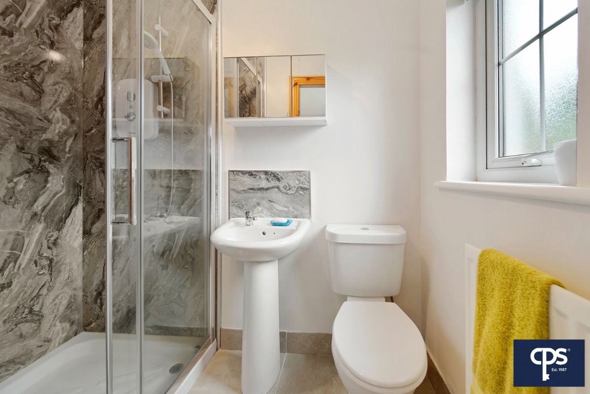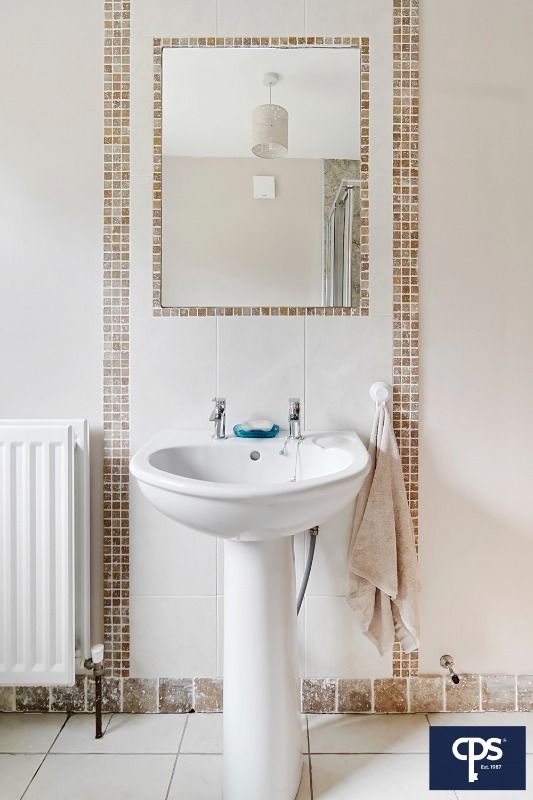 White suite comprising toilet, basin and pedestal. Panelled bath with mixer taps. Corner power shower. Tile flooring.