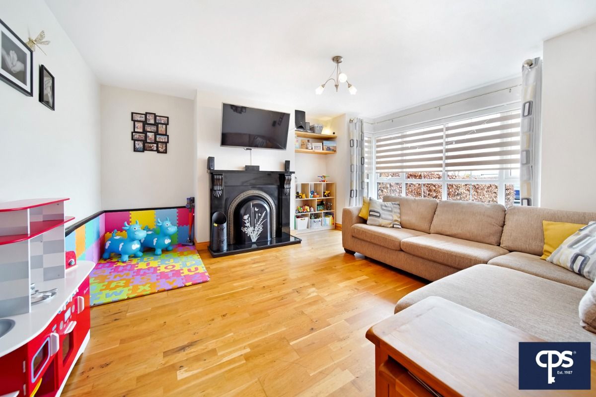 Large living room with bay window allowing natural light fill the room. Feature fireplace with open fire. Wooden flooring.