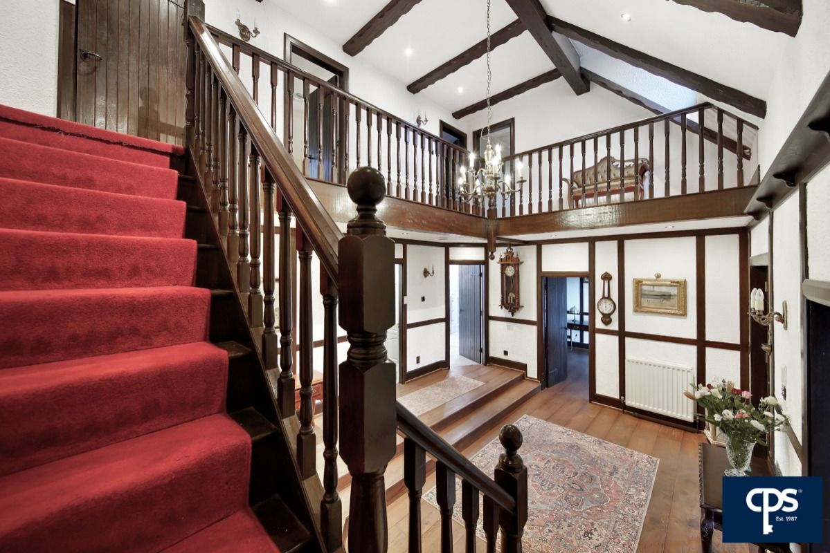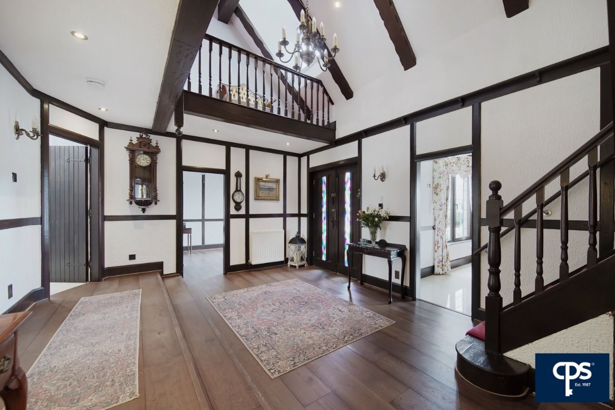 Double wooden doors with feature glass inset opening to entrance hall which is complete with solid oak flooring, stairwell, Philips hue spotlighting which is operated via Bluetooth.