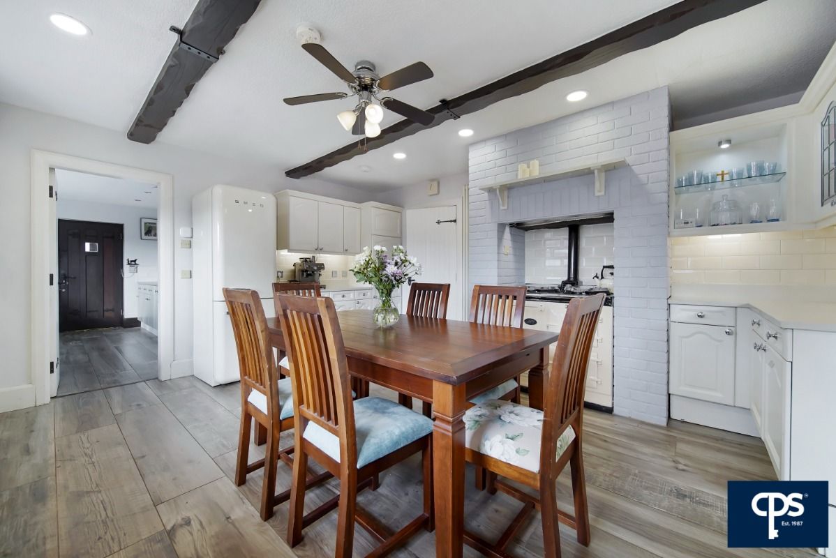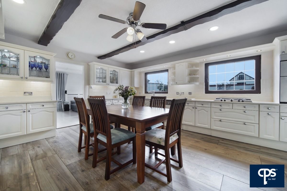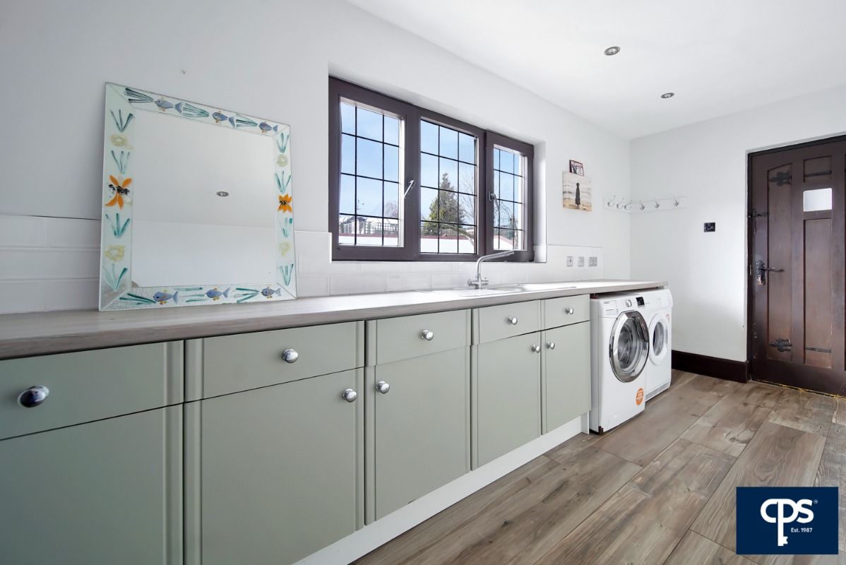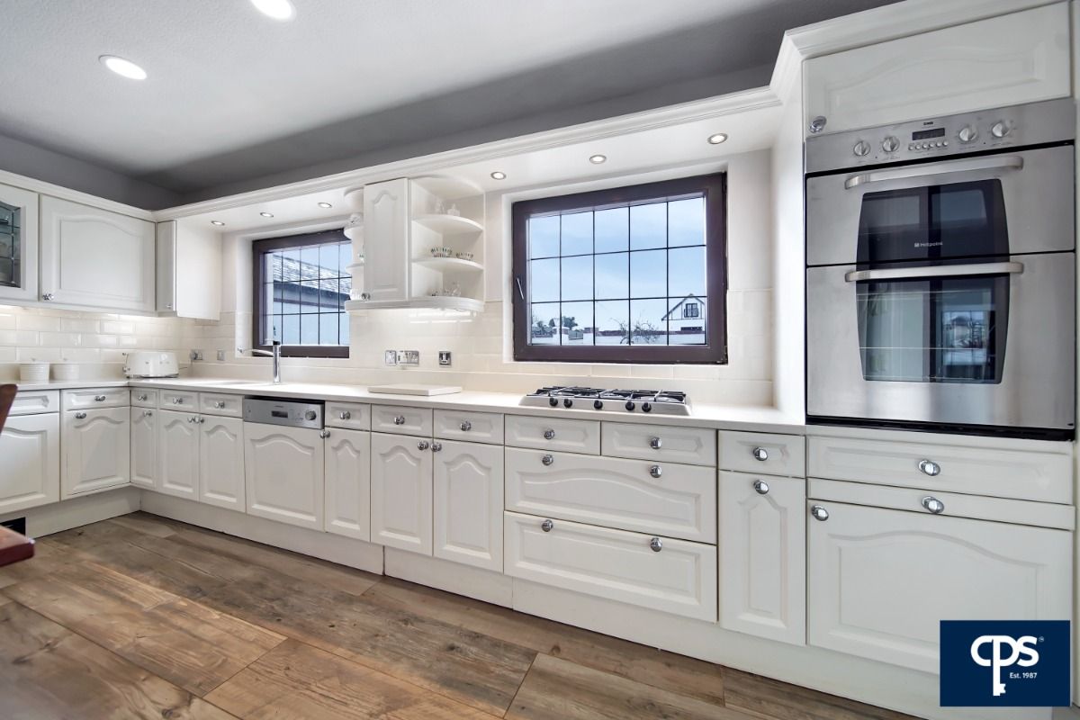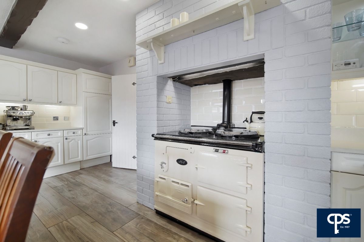 Spacious kitchen with an excellent range of high- & low-level units complete with granite worktop. Integrated Double oven. AGA rangemaster. Tile flooring with partial wall tiling.